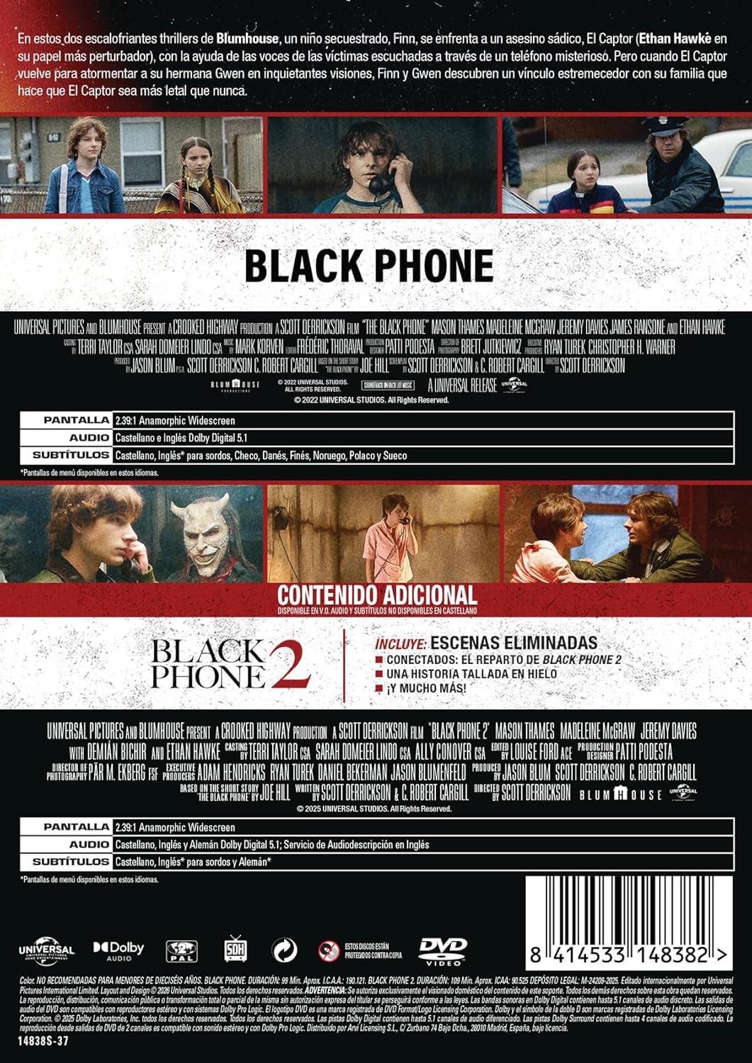 https://back.dvdstorespain.es/es/peliculas/129070-black-phone-pack-1-2-dvd-dvd-2026--8414533148382.html129070Black Phone + Black Phone 2 (Pack 1-2) [DVD] (2021, 2025) The Black Phone + Black Phone 2<p><b>Black Phone</b><b> (The Black Phone)</b><br />En una ciudad de Colorado, en los años 70, un enmascarado secuestra a Finney Shaw, un chico tímido e inteligente de 13 años, y le encierra en un sótano insonorizado donde de nada sirven sus gritos. Cuando un teléfono roto y sin conexión empieza a sonar, Finney descubre que a través de él puede oír las voces de las anteriores víctimas, las cuales están decididas a impedir que Finney acabe igual que ellas. </p><p><b>Black Phone 2</b><br />Secuela de "Black Phone". El Raptor quiere vengarse de Finn desde la tumba y escoge como objetivo a Gwen, su hermana pequeña. Gwen, una adolescente de 15 años con mucho carácter, empieza a recibir llamadas de un teléfono negro en sueños, acompañadas de inquietantes visiones de algo o alguien acechando a tres chicos en el campamento de invierno de Alpine Lake. Decidida a resolver el misterio y a acabar con el tormento de su hermano, Gwen convence a Finn para ir al campamento durante una tormenta de nieve. Juntos, los dos hermanos deberán enfrentarse a un asesino aún más poderoso desde la muerte. </p>https://dvdstorespain.es/1124544-home_default/black-phone-pack-1-2-dvd-dvd-2026-.jpg20.5785instock20.578520.5785002026-02-02T22:31:34+0100/Inicio/Inicio/DVD/Inicio/Películas/Inicio/Nuevos