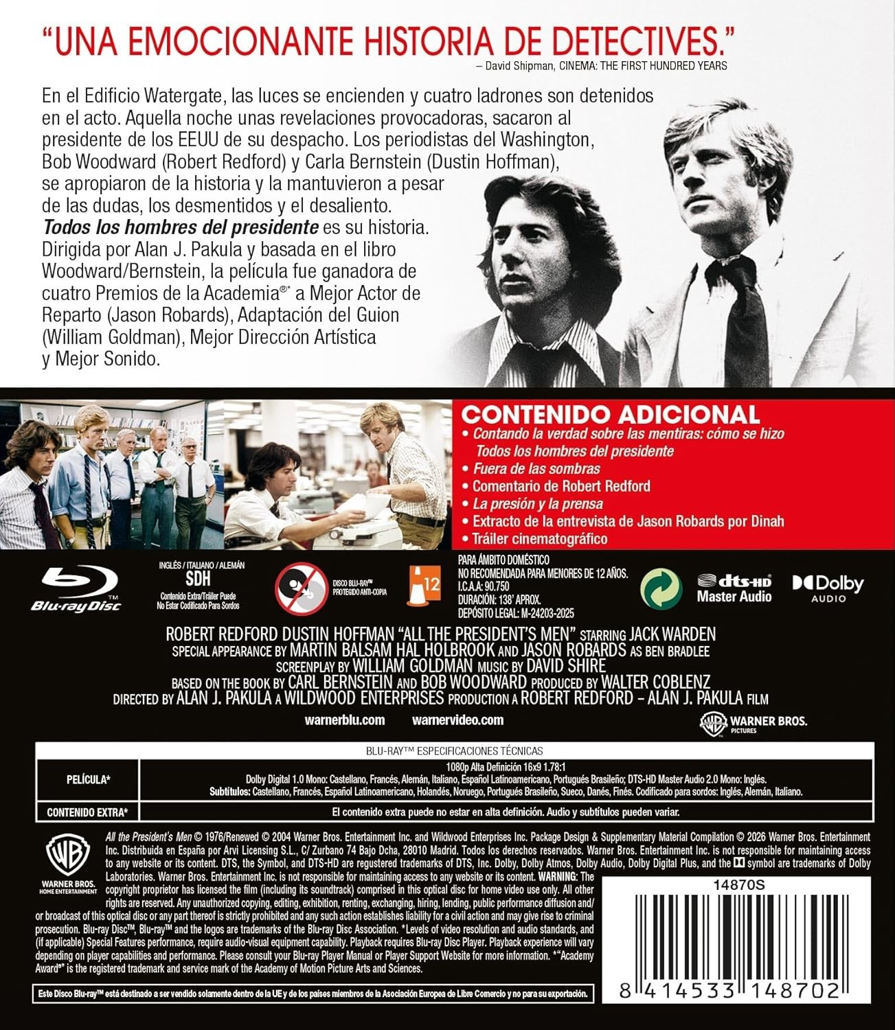 https://back.dvdstorespain.es/es/peliculas/129084-todos-los-hombres-del-presidente-bd-blu-ray-2026--8414533148702.html129084Todos los Hombres del Presidente [Blu-ray] (1976) All the President's MenEn 1972, dos jóvenes periodistas del diario The Washington Post, Bob Woodward (Robert Redford) y Carl Bernstein (Dustin Hoffman), comienzan a investigar lo que parece ser un simple allanamiento del cuartel general del Partido Demócrata en Washington. Sus descubrimientos desencadenan el llamado 'caso Watergate', que provocó la dimisión del presidente Richard Nixon. https://dvdstorespain.es/1124573-home_default/todos-los-hombres-del-presidente-bd-blu-ray-2026-.jpg11.7355instock11.735511.7355002026-02-02T22:32:46+0100/Inicio/Inicio/Blu-ray/Inicio/Películas/Inicio/Nuevos
