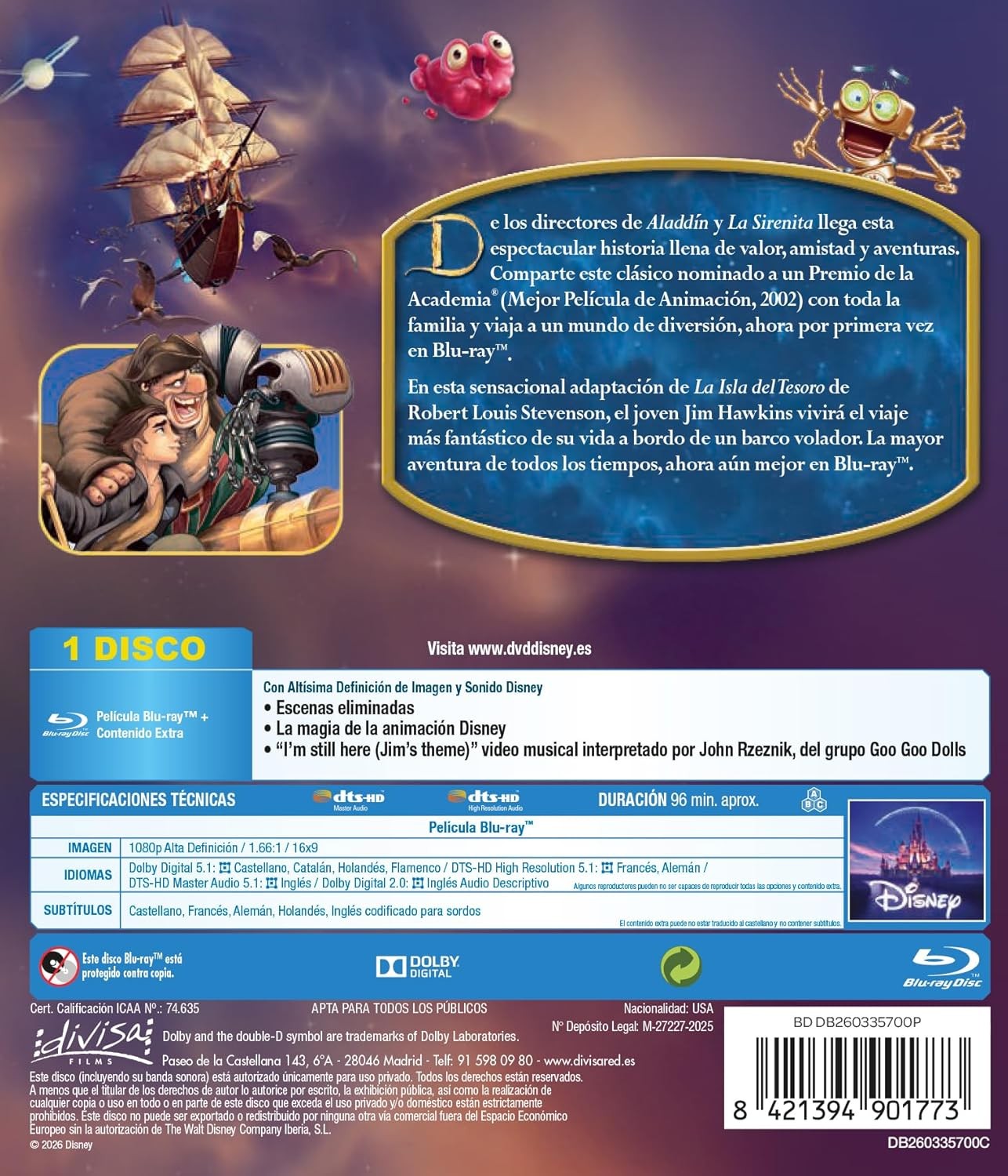 https://back.dvdstorespain.es/es/peliculas/129152-el-planeta-del-tesoro-treasure-planet-2002-blu-ray-blu-ray-2026--8421394901773.html129152El Planeta del Tesoro [Blu-ray] (2002) Treasure PlanetJim, popular surfista solar, se enfrenta a una cacería intergaláctica de tesoros. En sus manos cae un legendario mapa que le llevará a buscar la fortuna más grande del Universo. A bordo de un "galeón solar", Jim es el ayudante del cocinero del barco, John Silver (mitad hombre mitad máquina), que le enseña cómo ser un buen explorador del espacio. Jim conoce a un simpático robot llamado BEN (Bio Electro Navegador). Juntos, bajo el mando de la inteligente Capitán Amelia, descubrirán un tesoro inimaginable. Adaptación de la Disney del clásico de Robert Louis Stevenson "La isla del tesoro". https://dvdstorespain.es/1126359-home_default/el-planeta-del-tesoro-treasure-planet-2002-blu-ray-blu-ray-2026-.jpg10.6612instock10.661210.6612002026-02-05T21:46:36+0100/Inicio/Inicio/Blu-ray/Inicio/Películas/Inicio/Nuevos