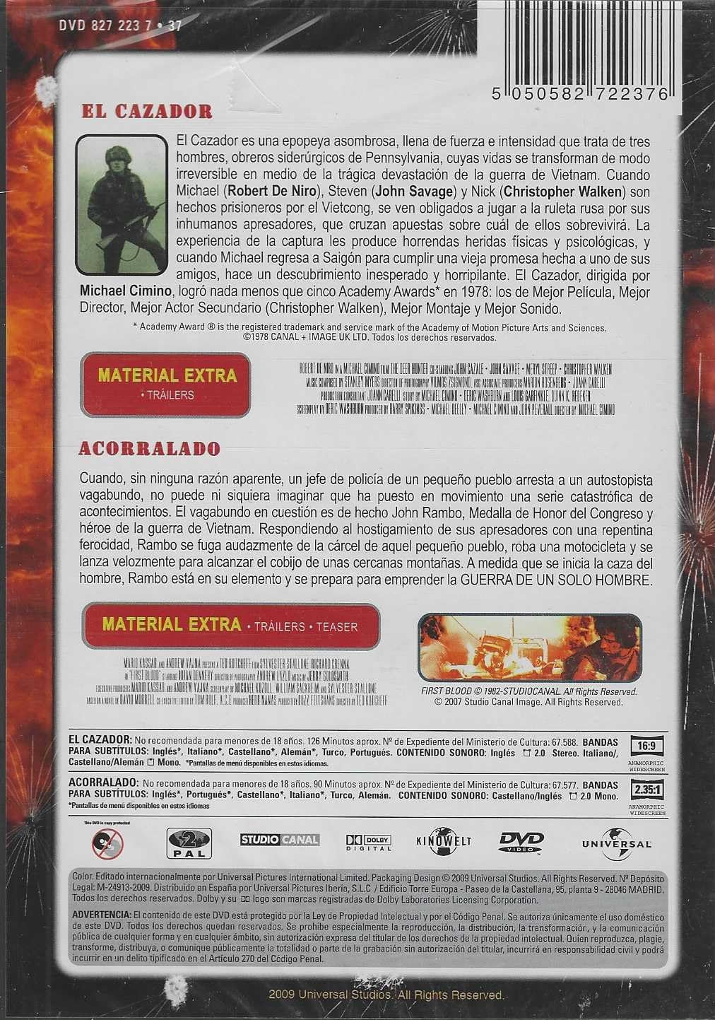https://back.dvdstorespain.es/es/peliculas/129193-el-cazador-y-rambo-acorralado-dvd-2-peliculas-cine-de-accion-dvd-2024--0634065166915.html129193El Cazador + Rambo Acorralado [DVD] (1978, 1982) The Deer Hunter + Rambo: First Blood<p><b>El cazador, 1978</B></B><b> (The Deer Hunter)</B><br>Tres amigos, amantes de la caza y que trabajan como obreros en una fábrica de fundición de acero de Pennsylvania, pasan juntos las últimas horas antes de despedirse para ir a luchar como voluntarios a la guerra de Vietnam, un conflicto bélico que les cambiará a todos la vida para siempre. </p><p><b>Rambo Acorralado, 1982</B><b> (Rambo: First Blood)</B><br>Cuando John Rambo, un veterano boina verde, va a visitar a un viejo compañero de armas, se entera de que ha muerto víctima de las secuelas de la guerra. Algunos días después, la policía lo detiene por vagabundo y se ensaña con él. Entonces recuerda las torturas que sufrió en Vietnam y reacciona violentamente. </p>https://dvdstorespain.es/1127235-home_default/el-cazador-y-rambo-acorralado-dvd-2-peliculas-cine-de-accion-dvd-2024-.jpg9.9174instock9.91749.9174002026-02-09T02:45:36+0100/Inicio/Inicio/DVD/Inicio/Películas/Inicio/Nuevos