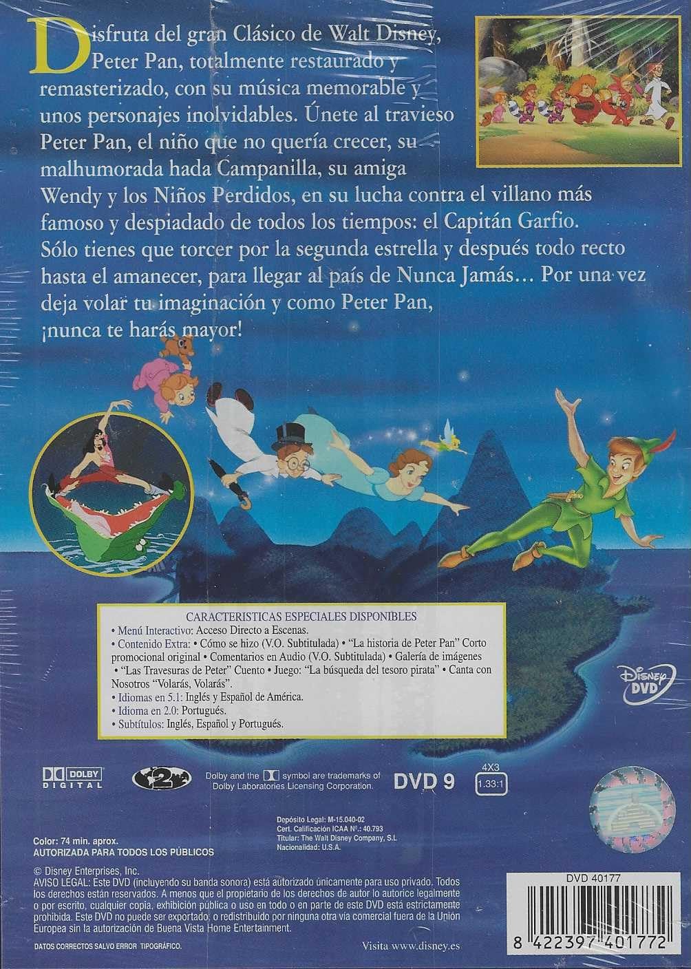 Sumérgete en el encantador mundo de Neverland con la edición especial en DVD de "Peter Pan", el clásico animado de Disney de 1953. Esta aventura mágica comienza cuando Peter Pan, el niño que no quería crecer, visita a Wendy, John y Michael Darling en Londres y los invita a volar con él a Neverland. Acompañados por el travieso hada Campanilla, los niños se embarcan en un viaje lleno de acción y emoción. En Neverland, se enfrentarán al temible Capitán Garfio y su banda de piratas, descubrirán tribus indígenas y se aliarán con los Niños Perdidos. La edición especial ofrece una restauración impresionante de la imagen y el sonido, permitiendo a los espectadores disfrutar de la vibrante animación y la memorable música como nunca antes. La película no solo captura la esencia de la juventud y la aventura, sino que también toca temas profundos como la amistad, la valentía y el poder de la imaginación. Un deleite para los espectadores de todas las edades, esta edición de "Peter Pan" asegura ser una joya en cualquier colección de clásicos del cine.</p>https://dvdstorespain.es/1127752-home_default/peter-pan-edicion-especial-dvd-dvd-2024-.jpg9.9174instock9.91749.9174002026-02-09T05:45:02+0100/Inicio/Inicio/DVD/Inicio/Películas/Inicio/Nuevos/Inicio/Prueba AI