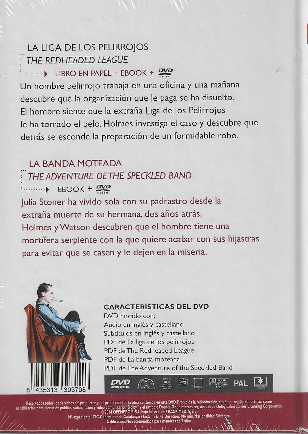 https://back.dvdstorespain.es/es/peliculas/129302-la-liga-de-los-pelirrojos-y-la-banda-moteada-sherlock-holmes-edicion-bilingue-libro-ebook-dvd-dvd-2024--605848635164.html129302La Liga de los Pelirrojos + la Banda Moteada, Sherlock Holmes (Edición bilingüe, Libro, eBook y DVD) [DVD, Libro] (1984)Serie de TV de 13 capítulos (1984-1985). Adaptación para televisión de las aventuras del detective Sherlock Holmes y su inseparable doctor Watson. En esta primera serie (de las cuatro protagonizadas por Jeremy Brett), el astuto Holmes resuelve casos clásicos como "Escándalo en Bohemia", "La liga de los pelirrojos" o "El problema final", en el que se enfrenta al legendario profesor Moriarty. https://dvdstorespain.es/1131025-home_default/la-liga-de-los-pelirrojos-y-la-banda-moteada-sherlock-holmes-edicion-bilingue-libro-ebook-dvd-dvd-2024-.jpg7.438instock7.4387.438002026-02-19T22:45:37+0100/Inicio/Inicio/DVD/Inicio/Películas/Inicio/Nuevos