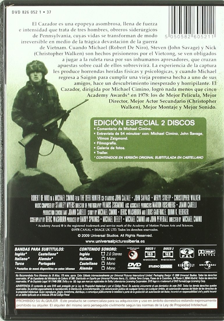 https://back.dvdstorespain.es/es/peliculas/129404-el-cazador-edicion-especial-2-discos-dvd-2009--5050582605211.html129404El Cazador (Edición especial 2 discos) [DVD] (1978) The Deer HunterTres amigos, amantes de la caza y que trabajan como obreros en una fábrica de fundición de acero de Pennsylvania, pasan juntos las últimas horas antes de despedirse para ir a luchar como voluntarios a la guerra de Vietnam, un conflicto bélico que les cambiará a todos la vida para siempre. https://dvdstorespain.es/1132590-home_default/el-cazador-edicion-especial-2-discos-dvd-2009-.jpg9.2562instock9.25629.2562002026-02-23T17:45:16+0100/Inicio/Inicio/DVD/Inicio/Películas/Inicio/Nuevos