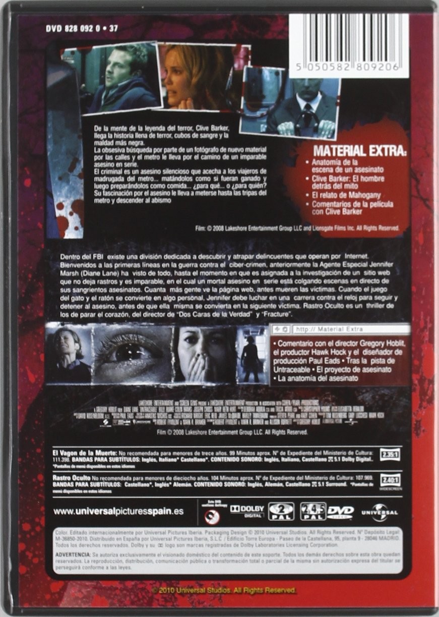 https://back.dvdstorespain.es/es/peliculas/129805-vagon-de-la-muerterastro-oculto-dvd-2010--5050582809206.html129805El Vagón De La Muerte + Rastro Oculto [DVD] (2008, 2008) The Midnight Meat Train + Untraceable<p><b>El vagón de la muerte, 2008</B></B><b> (The Midnight Meat Train)</B><br>La dueña de una exitosa galería de arte le propone al fotógrafo Leon Kauffman llevar a cabo un trabajo sobre la parte más oscura del ser humano. Sabiendo que ésta es su oportunidad para el éxito, Kauffman comienza una búsqueda obsesiva sobre el tema más oscuro que pueda existir, empezando a seguir los pasos de un asesino en serie llamado Mahogany, quien en el tren subterráneo descuartiza a sus víctimas que viajan en los servicios nocturnos. Aquí comienza un juego de obsesión que lleva al fotógrafo a meterse cada vez más profundo en los túneles de la ciudad hasta el punto de poner en riesgo su vida y la de su novia Maya, embarcándose en un viaje a las profundidades del horror. </p><p><b>Rastro oculto, 2008</B><b> (Untraceable)</B><br>El FBI cuenta con un departamento encargado de delitos cibernéticos que se dedica únicamente a investigar y perseguir a los delincuentes que actúan en Internet. En Portland, la agente especial Jennifer Marsh (Diane Lane) tiene que resolver un caso sin precedentes: un depredador cibernético cuelga torturas y asesinatos en una sofisticada página web que, al no dejar rastro, no puede ser desconectada. El destino de sus víctimas depende del público: cuantas más visitas registre la página web, más deprisa morirán. Cuando el juego del gato y el ratón se convierte en algo personal, Jennifer y su equipo deberán lanzarse a una carrera contrarreloj para encontrar al asesino. </p>https://dvdstorespain.es/1138599-home_default/vagon-de-la-muerterastro-oculto-dvd-2010-.jpg14.5455instock14.545514.5455002026-02-26T15:45:02+0100/Inicio/Inicio/DVD/Inicio/Películas/Inicio/Nuevos