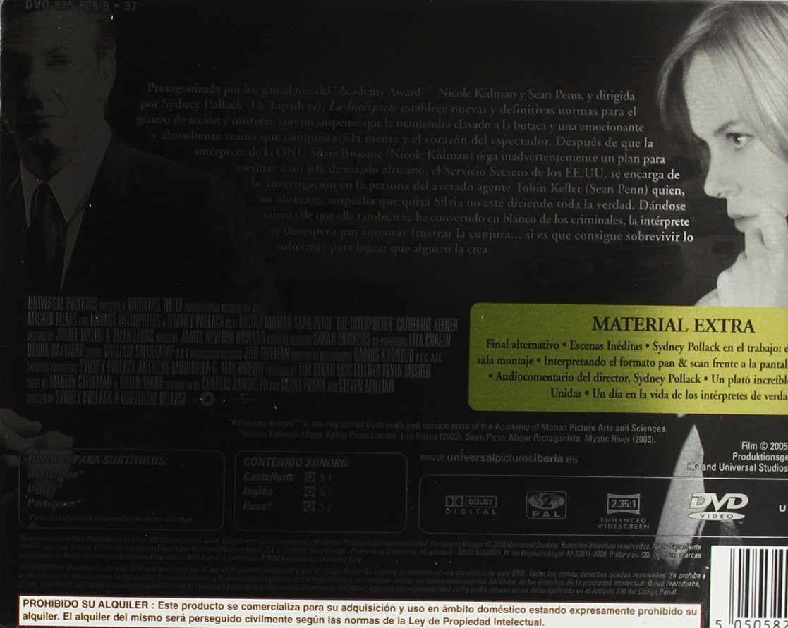 https://back.dvdstorespain.es/es/peliculas/129851-la-interprete-edicion-caja-metalica-dvd-2014--5050582580594.html129851La Intérprete (Edición caja metálica) [DVD] (2005) The InterpreterSilvia Broome (Nicole Kidman), intérprete de las Naciones Unidas, escucha, de forma casual, cómo amenazan de muerte a un presidente africano que, pese a estar acusado de genocidio, está a punto de pronunciar un discurso en la Asamblea General de la ONU. Tobin Keller (Sean Penn), el agente del Servicio Secreto encargado de protegerla hasta el día de la comparecencia sospecha, sin embargo, de los ideales que la mueven. https://dvdstorespain.es/1139389-home_default/la-interprete-edicion-caja-metalica-dvd-2014-.jpg11.9008instock11.900811.9008002026-02-27T01:45:13+0100/Inicio/Inicio/DVD/Inicio/Películas/Inicio/Nuevos