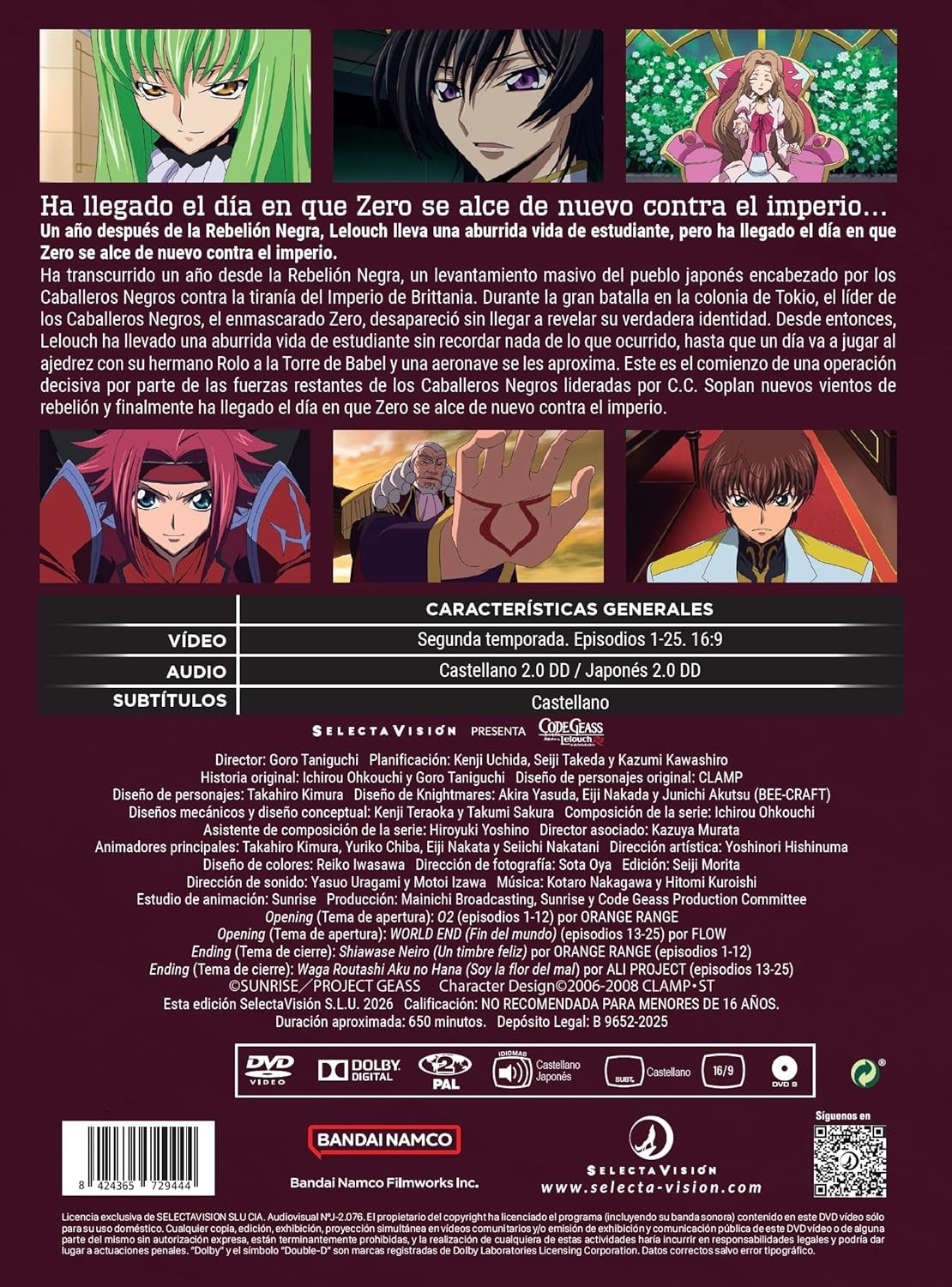 https://back.dvdstorespain.es/es/peliculas/129890-code-geass-lelouch-el-de-la-rebelion-r2-episodios-1-a-25-dvd-2026--8424365729444.html129890Code Geass - Lelouch, el de la Rebelión R2 [DVD] (2006) Kôdo Giasu: Hangyaku no RurûshuSerie de TV (2006). 25 episodios. El 10 de agosto de 2010 a.t.b, el Sacro Imperio de Britannia superó a las fuerzas japonesas y conquistó el país en menos de un mes, haciendo uso de sus armas robóticas, los "Knightmare Frames". Japón perdió su libertad y derechos, y pasó a ser denominado "Area 11". Sus habitantes, ahora llamados "Elevens", fueron obligados a sobrevivir en ghettos. Sin embargo aún persisten grupos que se resisten y luchan contra el Imperio por la independencia de Japón. Después de que su padre, el Emperador de Britannia, no hiciese nada para atrapar a los terroristas que asesinaron a su madre y lisiaron a su hermana, un niño llamado Lelouch juró destruir Britannia. Siete años más tarde en el Área 11 conoce a una misteriosa chica, con la que realiza un contrato a cambio de un poder llamado "Geass". Con él, Lelouch finalmente tiene el poder que necesita para derrotar a Britannia y realizar sus dos deseos: vengar a su madre y construir un mundo en el que su amada hermana pueda vivir feliz. https://dvdstorespain.es/1140002-home_default/code-geass-lelouch-el-de-la-rebelion-r2-episodios-1-a-25-dvd-2026-.jpg31.3223instock31.322331.3223002026-02-27T14:15:10+0100/Inicio/Inicio/DVD/Inicio/Películas/Inicio/Nuevos