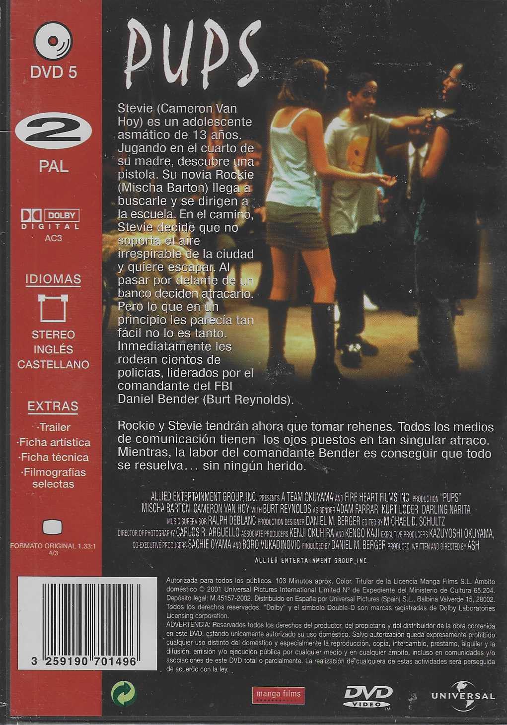 https://back.dvdstorespain.es/es/peliculas/129950-pups-dvd-dvd-2024--3259190701496.html129950Pups [DVD] (1999)Stevie (Cameron Van Hoy) es un adolescente asmático de 13 años. Jugando en el cuarto de su madre, descubre una pistola. Su novia Rockie (Mischa Barton) llega a buscarle y se dirigen a la escuela. En el camino, Stevie decide que no soporta el aire irrespirable de la ciudad y quiere escapar. Al pasar por delante de un banco deciden robarlo. Pero lo que en un principio les parecía tan fácil no lo es tanto. Inmediatamente les rodean cientos de policías, liderados por el comandante del FBI Daniel Bender (Burt Reynolds). Rockie y Stevie tendrán ahora que tomar rehenes. Todos los medios de comunicación tienen los ojos puestos en tan singular atraco. Mientras, la labor del comandante Bender es conseguir que todo se resuelva sin ningún herido. https://dvdstorespain.es/1140969-home_default/pups-dvd-dvd-2024-.jpg7.9339instock7.93397.9339002026-03-01T03:15:02+0100/Inicio/Inicio/DVD/Inicio/Películas/Inicio/Nuevos
