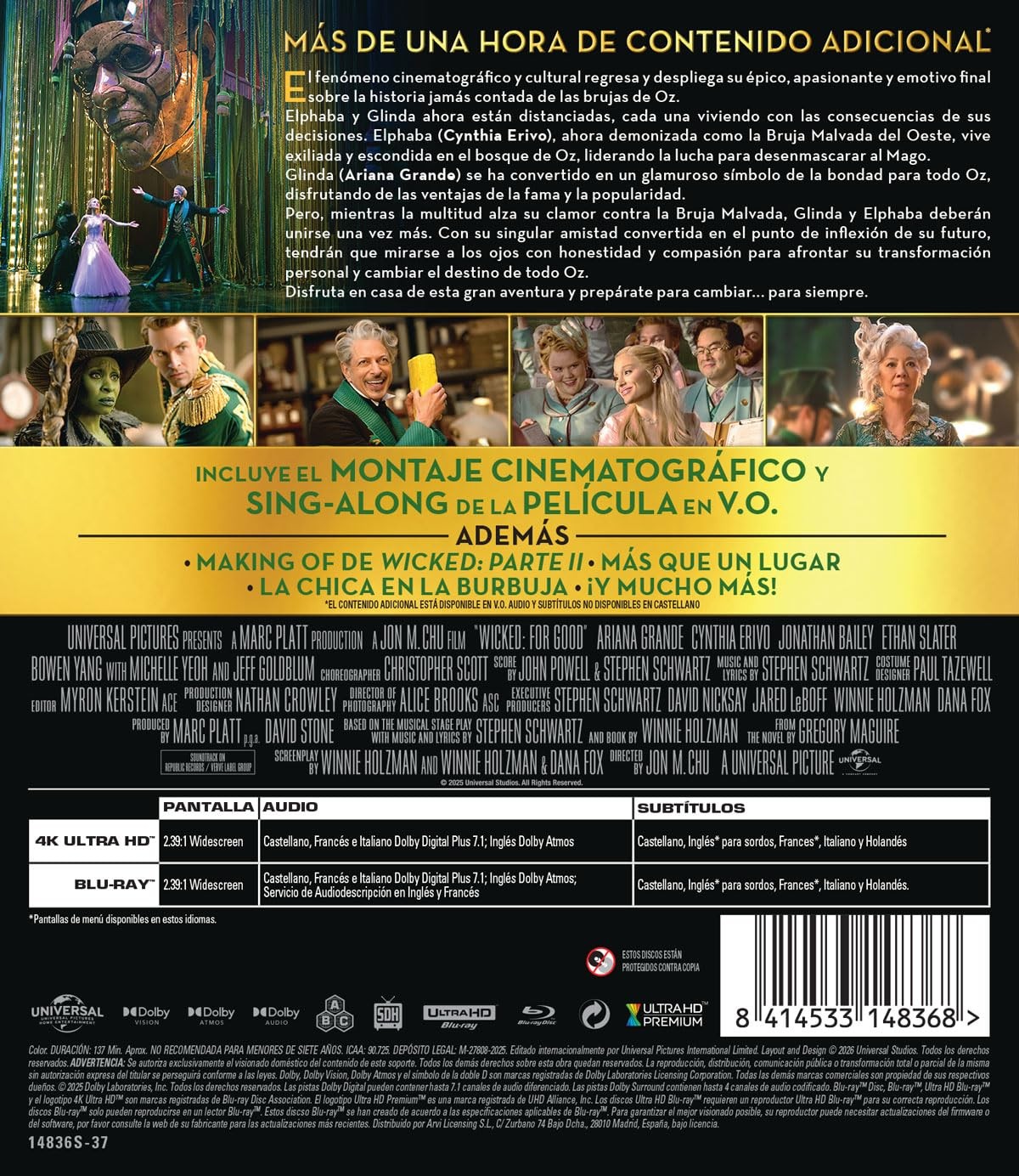 https://back.dvdstorespain.es/es/peliculas/130015-wicked-parte-ii-4k-uhd-bd-blu-ray-2026--8414533148368.html130015Wicked: Parte II [4K UHD, Blu-ray] (2025) Wicked: For GoodSegunda parte de la adaptación cinematográfica del musical de Broadway. El capítulo final de la historia jamás contada de las brujas de Oz comienza con Elphaba y Glinda distanciadas y viviendo las consecuencias de sus respectivas decisiones. Mientras la multitud alza su clamor contra la Bruja Malvada, ambas deberán unirse una vez más. Con su singular amistad convertida en el punto de inflexión de su futuro, tendrán que mirarse a los ojos con honestidad y compasión para afrontar su transformación personal y cambiar el destino de todo Oz. https://dvdstorespain.es/1142053-home_default/wicked-parte-ii-4k-uhd-bd-blu-ray-2026-.jpg22.2314instock22.231422.2314002026-03-02T20:45:17+0100/Inicio/Inicio/Blu-ray/Inicio/Películas/Inicio/Nuevos/Inicio/4K-UHD