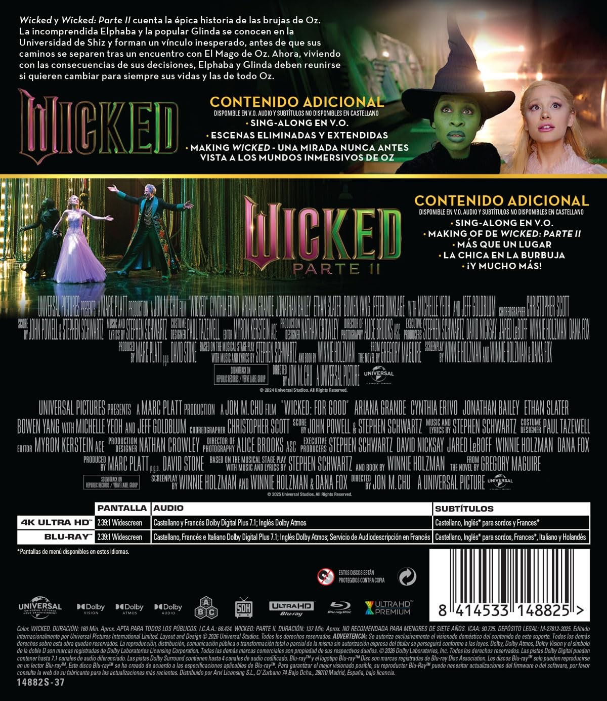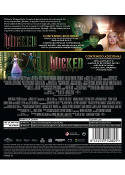 https://back.dvdstorespain.es/es/peliculas/130027-wicked-12-4k-uhd-blu-ray-2024-2025-8414533148825.html130027Wicked 1+2 [4K UHD, Blu-ray] (2024, 2025)<p><b>Wicked, 2024</b><b> (Wicked: Part One)</b><br />Ambientada en la Tierra de Oz, mucho antes de la llegada de Dorothy Gale desde Kansas. Elphaba es una joven incomprendida por su inusual color verde que aún no ha descubierto su verdadero poder. Glinda es una popular joven marcada por sus privilegios y su ambición que aún no ha descubierto su verdadera pasión. Las dos se conocen como estudiantes de la Universidad Shiz, en la fantástica Tierra de Oz, y forjan una insólita pero profunda amistad. La trama abarca los acontecimientos del primer acto del musical de Broadway. </p><p><b>Wicked: Parte II, 2025</b><b> (Wicked: For Good)</b><br />Segunda parte de la adaptación cinematográfica del musical de Broadway. El capítulo final de la historia jamás contada de las brujas de Oz comienza con Elphaba y Glinda distanciadas y viviendo las consecuencias de sus respectivas decisiones. Mientras la multitud alza su clamor contra la Bruja Malvada, ambas deberán unirse una vez más. Con su singular amistad convertida en el punto de inflexión de su futuro, tendrán que mirarse a los ojos con honestidad y compasión para afrontar su transformación personal y cambiar el destino de todo Oz. </p>https://dvdstorespain.es/1142077-home_default/wicked-12-4k-uhd-blu-ray-2024-2025.jpg32.9752instock32.975232.9752002026-03-02T20:47:07+0100/Inicio/Inicio/Películas/Inicio/Nuevos/Inicio/4K-UHD