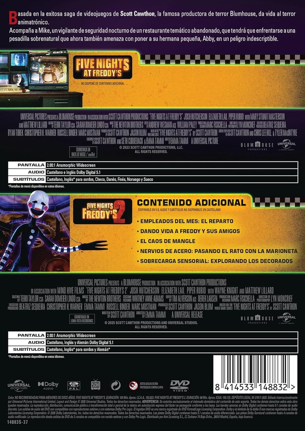 https://back.dvdstorespain.es/es/peliculas/130028-five-nights-at-freddys-pack-1-2-dvd-dvd-2026--8414533148832.html130028Five Nights At Freddy´S. Pack 1-2 [DVD] (2023, 2025)<p><b>Five Nights at Freddy's, 2023</b><br />Un hombre comienza un trabajo como guardia de seguridad nocturno en el restaurante Freddy Fazbear's Pizza, donde descubre que los animatrónicos se mueven por la noche y matan a cualquiera que vean. Adaptación de la exitosa saga de videojuegos homónima creada en 2014 por Scott Cawthon. </p><p><b>Five Nights at Freddy’s 2, 2025</b><br />Ha transcurrido un año desde la pesadilla sobrenatural en la pizzería de Freddy Fazbear. La historia de lo que ocurrió allí ha ido adquiriendo la talla de leyenda local, e incluso ha dado pie al primer “Faszfest”. El exguarda de seguridad Mike y la agente de policía Vanessa han ocultado la verdad a Abby, la hermana de 11 años de Mike, acerca del destino de sus amigos animatrónicos. Pero cuando Abby decide reconectar con Freddy, Bonnie, Chica y Foxy, desatará una serie de acontecimientos aterradores que revelarán oscuros secretos sobre el verdadero origen de Freddy’s, desencadenando un horror que llevaba décadas escondido y olvidado.</p>https://dvdstorespain.es/1142079-home_default/five-nights-at-freddys-pack-1-2-dvd-dvd-2026-.jpg20.5785instock20.578520.5785002026-03-02T20:47:12+0100/Inicio/Inicio/DVD/Inicio/Películas/Inicio/Nuevos