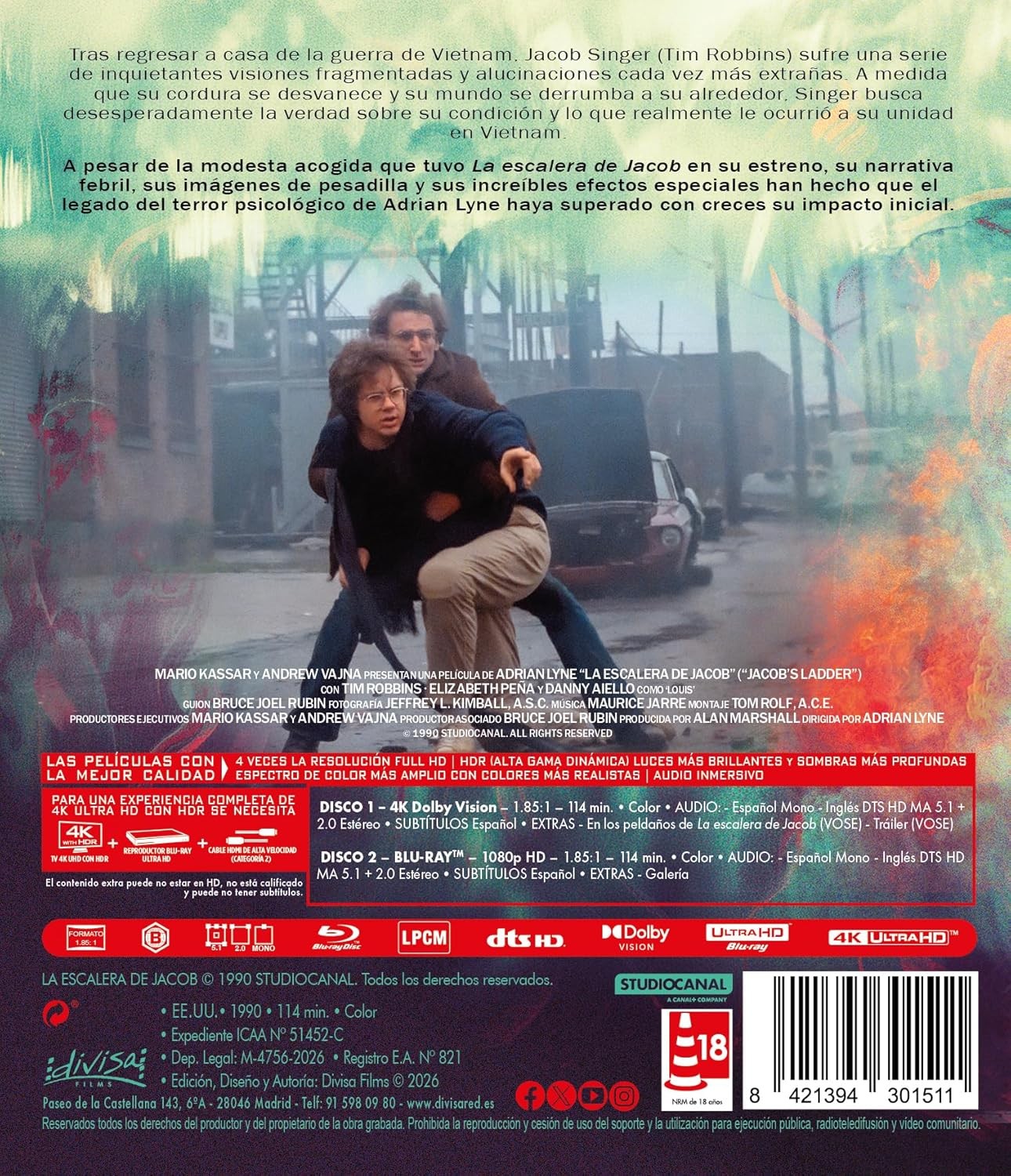 https://back.dvdstorespain.es/es/peliculas/130121-la-escalera-de-jacob-jacob-s-ladder-1990-adrian-lyne-4k-uhd-blu-ray-blu-ray-2026--8421394301511.html130121La Escalera de Jacob [4K UHD, Blu-ray] (1990) Jacob's LadderNarra las secuelas que sufre un soldado que participó en la guerra de Vietnam. El cartero neoyorkino Jacob Singer intenta evitar que los jirones de su vida terminen de deshilacharse. Lo acosan incesantes flashbacks de su primer matrimonio, de su hijo muerto y de su periodo de servicio en Vietnam. En su nueva esposa busca un asidero hacia la lucidez, pero la línea entre la realidad y el delirio se hace cada vez más delgada.https://dvdstorespain.es/1143844-home_default/la-escalera-de-jacob-jacob-s-ladder-1990-adrian-lyne-4k-uhd-blu-ray-blu-ray-2026-.jpg21.4876instock21.487621.4876002026-03-05T19:32:37+0100/Inicio/Inicio/Películas/Inicio/Nuevos/Inicio/4K-UHD