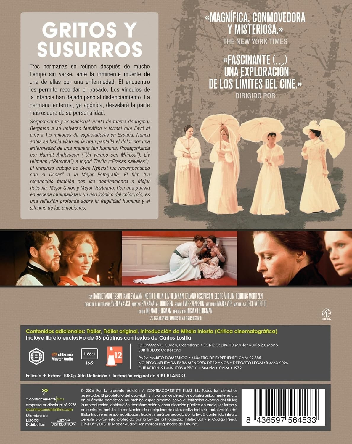 https://back.dvdstorespain.es/es/peliculas/130207-gritos-y-susurros-blu-ray-2026--8436597564533.html130207Gritos y Susurros (Libreto 36 págs) [Blu-ray, Libro] (1972) Viskningar och ropAnte la proximidad de la muerte de una de ellas, tres hermanas se reúnen en la vieja mansión familiar. Una vez en la casa, comienzan a recordar el pasado, y cuando la enferma entra en la agonía desvela la parte más oscura y tortuosa de su vida. https://dvdstorespain.es/1145703-home_default/gritos-y-susurros-blu-ray-2026-.jpg15.6198instock15.619815.6198002026-03-11T21:30:57+0100/Inicio/Inicio/Blu-ray/Inicio/Películas/Inicio/Nuevos