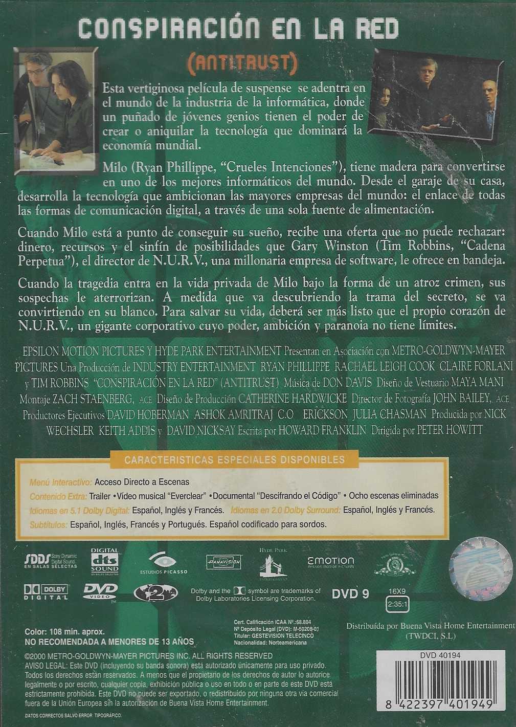 https://back.dvdstorespain.es/es/peliculas/130228-conspiracion-en-la-red-dvd--8422397401949.html130228Conspiracion en la Red [DVD] (2001) AntitrustMilo (Ryan Phillippe), un joven genio, está dotado para convertirse en uno de los mejores informáticos del mundo. En el garaje de su casa, desarrolla la tecnología que ambicionan las mayores empresas del mundo: un revolucionario software que permite el enlace de todas las formas de comunicación digital, a través de una sola fuente de alimentación. Cuando Milo está a punto de conseguir su sueño, recibe una tentadora oferta: dinero, recursos y un sinfin de posibilidades que Gary Winston (Tim Robbins), el director de N.U.R.V., una millonaria y poderosa empresa de software, le ofrece en bandeja.https://dvdstorespain.es/1153330-home_default/conspiracion-en-la-red-dvd-.jpg9.2562instock9.25629.2562002026-03-12T15:45:06+0100/Inicio/Inicio/DVD/Inicio/Películas/Inicio/Nuevos