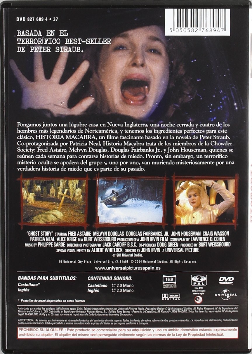 https://back.dvdstorespain.es/es/peliculas/130512-historia-macabra-dvd-2010--5050582768947.html130512Historia Macabra [DVD] (1981) Ghost StoryCuatro veteranos camaradas de toda la vida (Fred Astaire, Melvyn Douglas, Douglas Fairbanks Jr. y John Houseman), miembros de una prestigiosa sociedad, viven atormentados por un secreto: se trata del fantasma de una mujer (Alice Krige) que se niega a desaparecer y ha regresado para intentar asesinarlos a todos. https://dvdstorespain.es/1150023-home_default/historia-macabra-dvd-2010-.jpg11.9008instock11.900811.9008002026-03-18T19:45:03+0100/Inicio/Inicio/DVD/Inicio/Películas/Inicio/Nuevos
