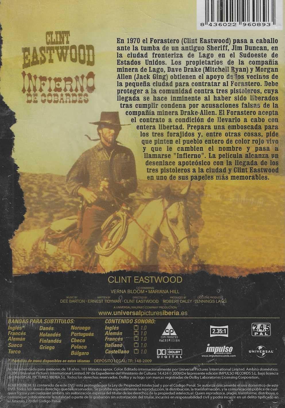 https://back.dvdstorespain.es/es/peliculas/130617-infierno-de-cobardes-dvd-dvd-2024--0605848967302.html130617Infierno de Cobardes [DVD] (1973) High Plains DrifterEn 1870, un forastero (Clint Eastwood) pasa a caballo por la tumba de Jim Duncan, antiguo sheriff de la ciudad fronteriza de Lago, en el sudoeste de Estados Unidos. Los propietarios de la compañía minera, Dave Drake (Mitchell Ryan) y Morgan Allen (Jack Ging) lo contratan para que los defienda de tres pistoleros que, recién salidos de la cárcel, están a punto de llegar a la ciudad. El forastero acepta el trato a condición de hacer las cosas a su manera. https://dvdstorespain.es/1151850-home_default/infierno-de-cobardes-dvd-dvd-2024-.jpg9.2562instock9.25629.2562002026-03-20T01:16:51+0100/Inicio/Inicio/DVD/Inicio/Películas/Inicio/Nuevos