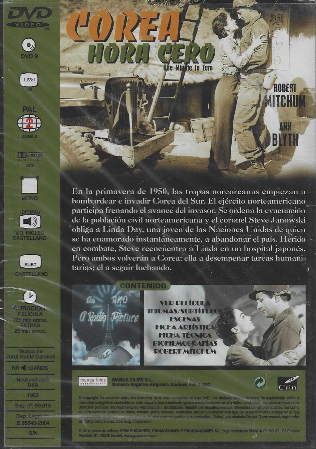 https://back.dvdstorespain.es/es/peliculas/130711-corea-hora-cero-dvd-1952-dvd-2024--0605848007886.html130711Corea, Hora Cero [DVD] (1952) One Minute to ZeroEn la primavera de 1950, las tropas norcoreanas empiezan a bombardear e invadir Corea del Sur. El ejército estadounidense trata de frenar el avance del invasor. Se ordena la evacuación de la población civil norteamericana, y el coronel Steve Janowski obliga a Linda Day, una funcionaria de las Naciones Unidas de quien se ha enamorado instantáneamente, a abandonar el país. Herido en combate, Steve reencuentra a Linda en un hospital japonés. Pero ambos volverán a Corea: ella a desempeñar tareas humanitarias, y él a seguir luchando. https://dvdstorespain.es/1153413-home_default/corea-hora-cero-dvd-1952-dvd-2024-.jpg4.6281instock4.62814.6281002026-03-20T20:45:10+0100/Inicio/Inicio/DVD/Inicio/Películas/Inicio/Nuevos