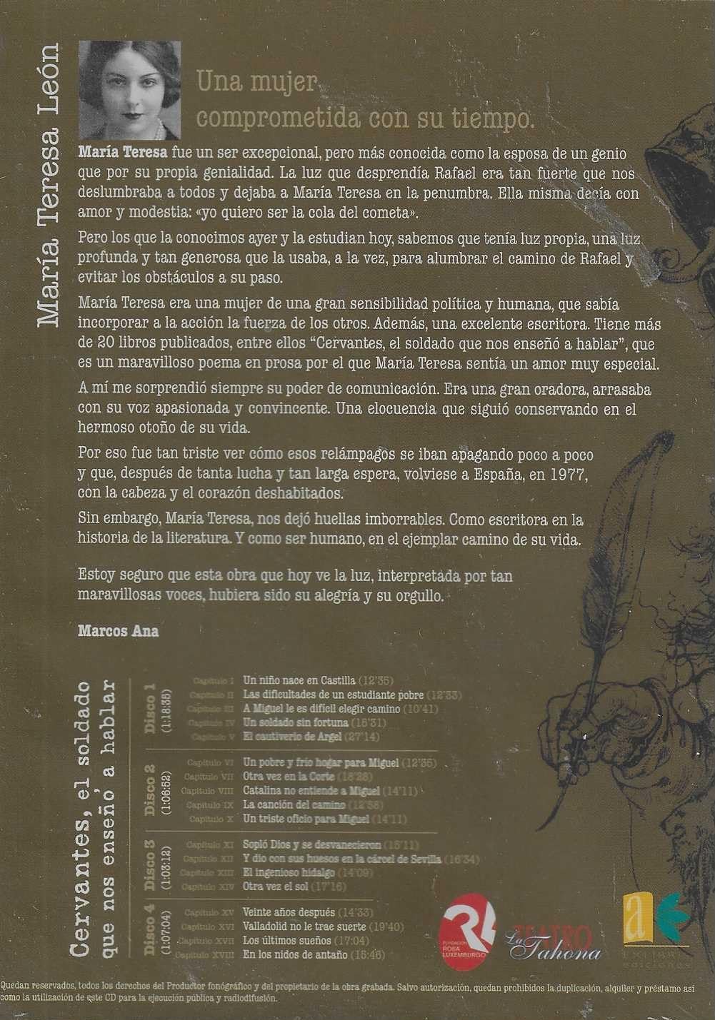 Cervantes: El Soldado que nos Enseñó a Hablar es una fascinante versión dramatizada de la célebre novela de María Teresa León, una de las escritoras más destacadas de la literatura española. Este DVD presenta la vida del inmortal Miguel de Cervantes, desde su infancia en Castilla hasta sus últimos años, explorando sus aventuras como soldado, su cautiverio en Argel y su camino hacia la creación literaria. La obra está dividida en cuatro discos con un total de dieciocho capítulos que narran con detalle y emoción los momentos más significativos de la vida del autor del Quijote. Interpretada por magníficas voces y producida con gran cuidado artístico, esta producción rinde homenaje tanto a Cervantes como a la propia María Teresa León, una mujer de extraordinaria sensibilidad política y literaria. Un producto imprescindible para los amantes de la historia, la literatura y la cultura española.