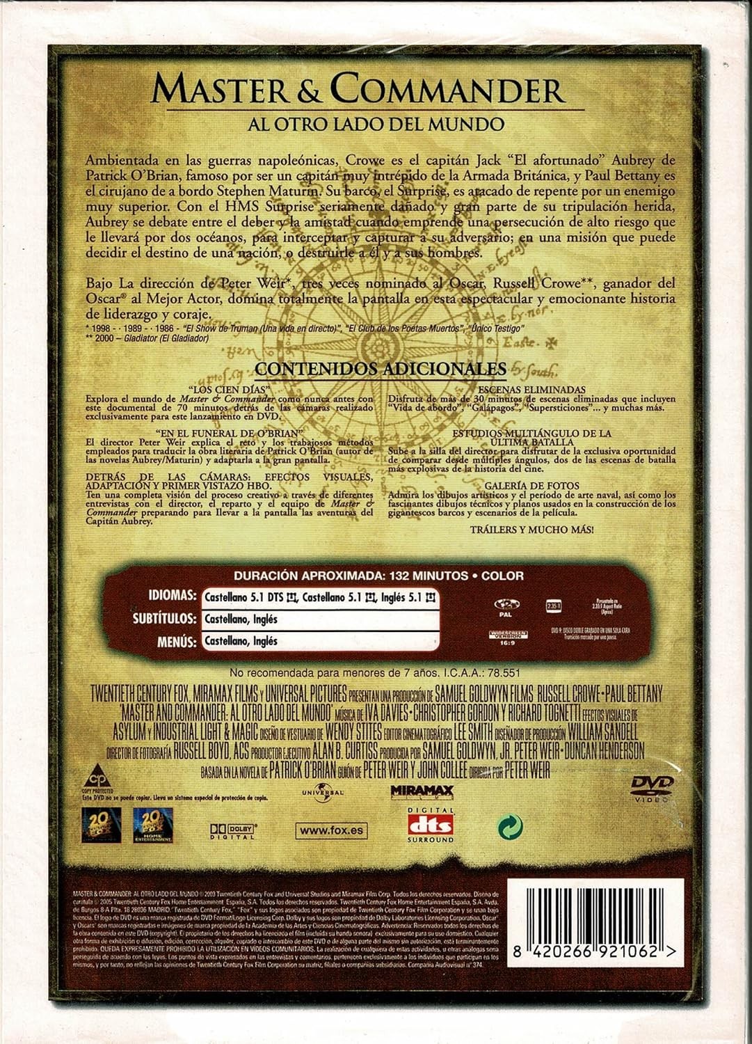 https://back.dvdstorespain.es/es/peliculas/130777-master-commander-2-dvd-2013--8420266921062.html130777Master And Commander: al Otro Lado del Mundo [DVD] (2003) Master and Commander: The Far Side of the WorldGuerras napoleónicas, año 1805. Bonaparte domina Europa. Inglaterra consigue resistir porque es la primera potencia naval del mundo. Precisamente por eso los mares se convierten en un crucial y estratégico campo de batalla. En el Atlántico, el Surprise, un navío inglés capitaneado por Jack Aubrey (Crowe), es atacado por sorpresa por un buque de guerra francés. A pesar de los graves daños sufridos por la nave, Aubrey decide navegar a través de dos mares para interceptar y capturar al enemigo. Se trata de una misión que puede determinar el destino de toda una nación. https://dvdstorespain.es/1154329-home_default/master-commander-2-dvd-2013-.jpg7.2727instock7.27277.2727002026-03-20T23:15:02+0100/Inicio/Inicio/DVD/Inicio/Películas/Inicio/Nuevos