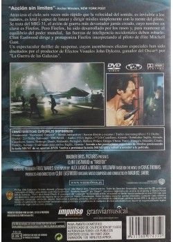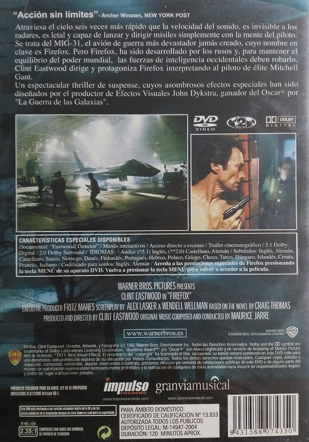 https://back.dvdstorespain.es/es/peliculas/130805-firefox-dvd--8431588074350.html130805Firefox: el Arma Definitiva [DVD] (1982) FirefoxLos soviéticos han desarrollado un prototipo de avión de combate muy sofisticado. Cuando los sistemas de espionaje de la OTAN lo descubren, deciden enviar al piloto de elite Mitchell Gant (Clint Eastwood) para que lo robe de la base de alta seguridad en la que se encuentra y lo traiga a occidente. El ingenio, cuyo nombre en clave es "Firefox", está capacitado para alcanzar velocidades increíbles; ofrece una maniobrabilidad jamás soñada por los ingenieros de aviónica occidentales, y posee un sistema de armas tan futurista que basta el pensamiento del piloto para accionarlo. Gant acepta la misión, aunque sufre una rara enfermedad que le causa desorientación y dificulta sus movimientos. https://dvdstorespain.es/1154719-home_default/firefox-dvd-.jpg7.2727instock7.27277.2727002026-03-21T00:30:27+0100/Inicio/Inicio/DVD/Inicio/Películas/Inicio/Nuevos
