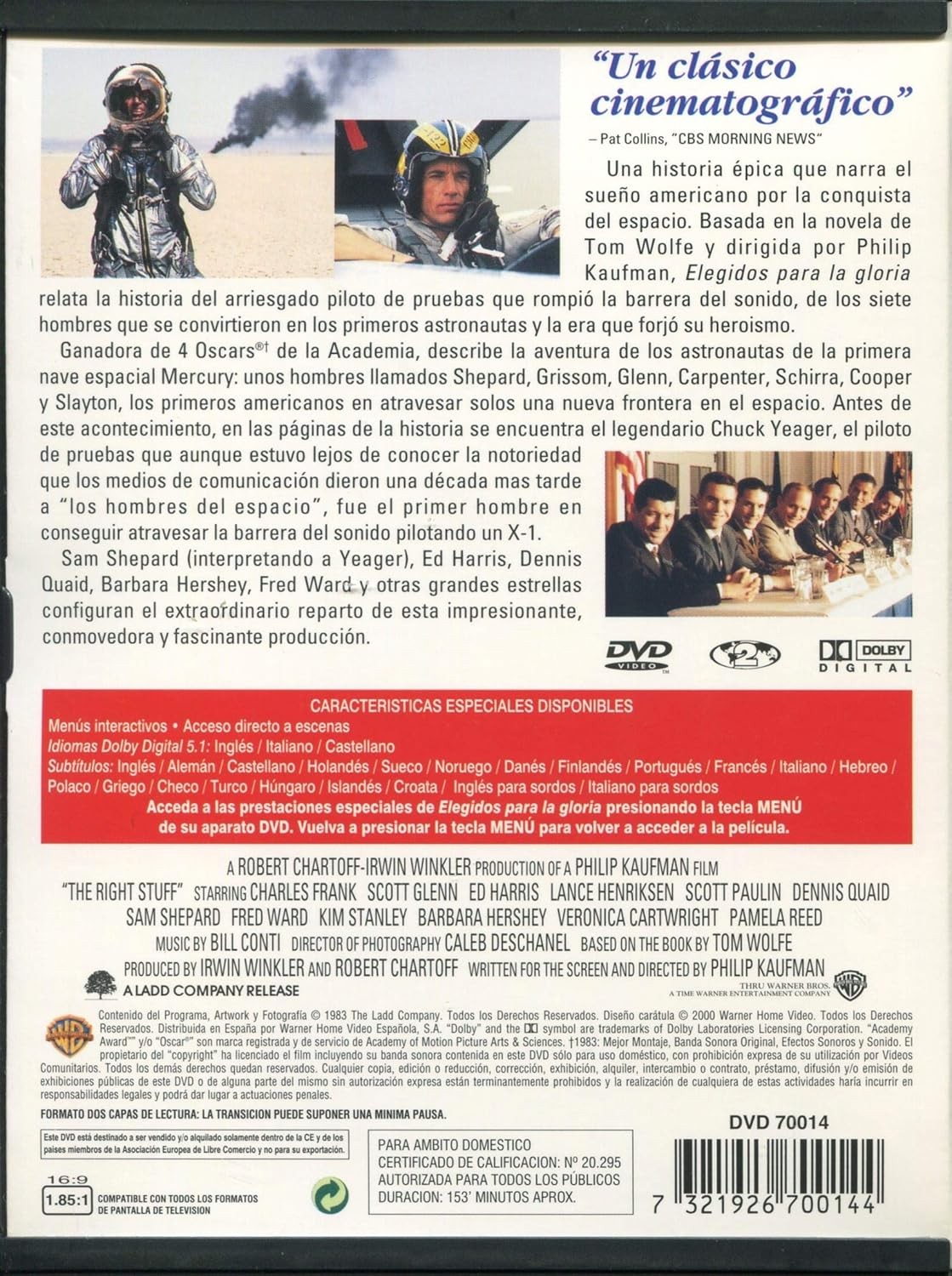 Sinopsis Chuck Yeager fue un intrépido piloto de pruebas que rompió la barrera del sonido pilotando un x-1. A pesar de ello, nunca alcanzó la fama que consiguieron los primeros astronautas que formaron la tripulación de la Mercury, la primera nave espacial: Shepard, Grissom, Glenn, Carpenter, Schirra, Cooper y Slayton.