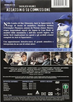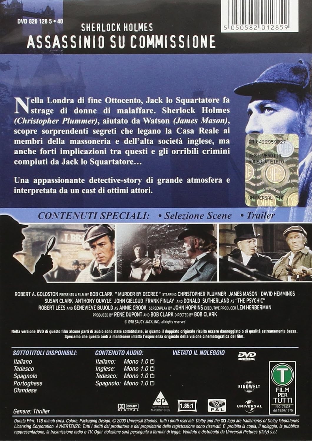 https://back.dvdstorespain.es/es/peliculas/131294-assassinio-su-commissione-dvd-dvd-2014--5050582012859.html131294Assassinio su Commissione [Italia] [DVD] (1979) Murder by DecreeLondres, 1888. En el barrio de Whitechapel se producen una serie de violentos y sanguinarios crímenes que tienen algo en común: las víctimas son siempre prostitutas asesinadas en oscuros callejones. El asesino será pronto conocido con el nombre de Jack el Destripador. En Baker Street, Sherlock Holmes y su ayudante el Doctor Watson empiezan a investigar por su cuenta los horribles crímenes que tienen aterrorizada a la ciudad. A pesar de que el jefe de Scotland Yard preferiría no hacerlo, no tiene más remedio que pedirles ayuda para resolver el caso. A medida que pasa el tiempo, el asesino ataca también a personas de la alta sociedad, y se descubre una misteriosa conspiración en la que participan masones y miembros de la familia real. https://dvdstorespain.es/1162163-home_default/assassinio-su-commissione-dvd-dvd-2014-.jpg4.6281instock4.62814.6281002026-03-30T17:17:53+0200/Inicio/Inicio/DVD/Inicio/Películas/Inicio/Nuevos