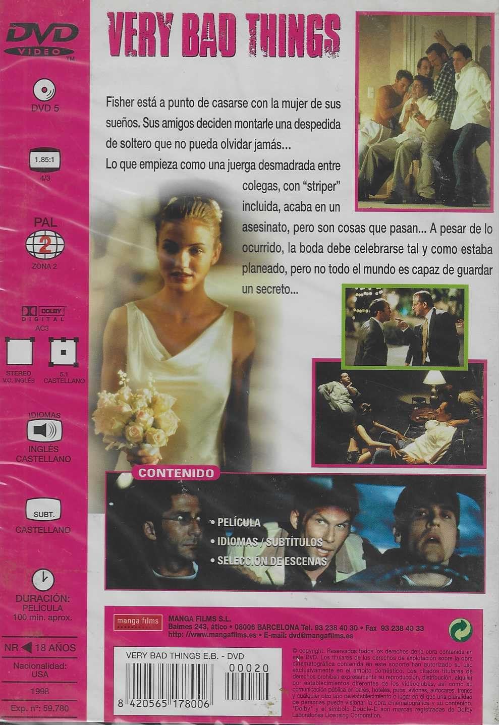 https://back.dvdstorespain.es/es/peliculas/131468-very-bad-things-dvd-edicion-basica-dvd-2024--0605848266610.html131468Very Bad Things (Edición básica) [DVD] (1998)Fisher está a punto de casarse con la mujer de sus sueños. Sus amigos deciden montarle en Las Vegas una inolvidable despedida de soltero. Y, efectivamente, ninguno de ellos la olvidará jamás... https://dvdstorespain.es/1162675-home_default/very-bad-things-dvd-edicion-basica-dvd-2024-.jpg4.6281instock4.62814.6281002026-03-30T17:51:32+0200/Inicio/Inicio/DVD/Inicio/Películas/Inicio/Nuevos