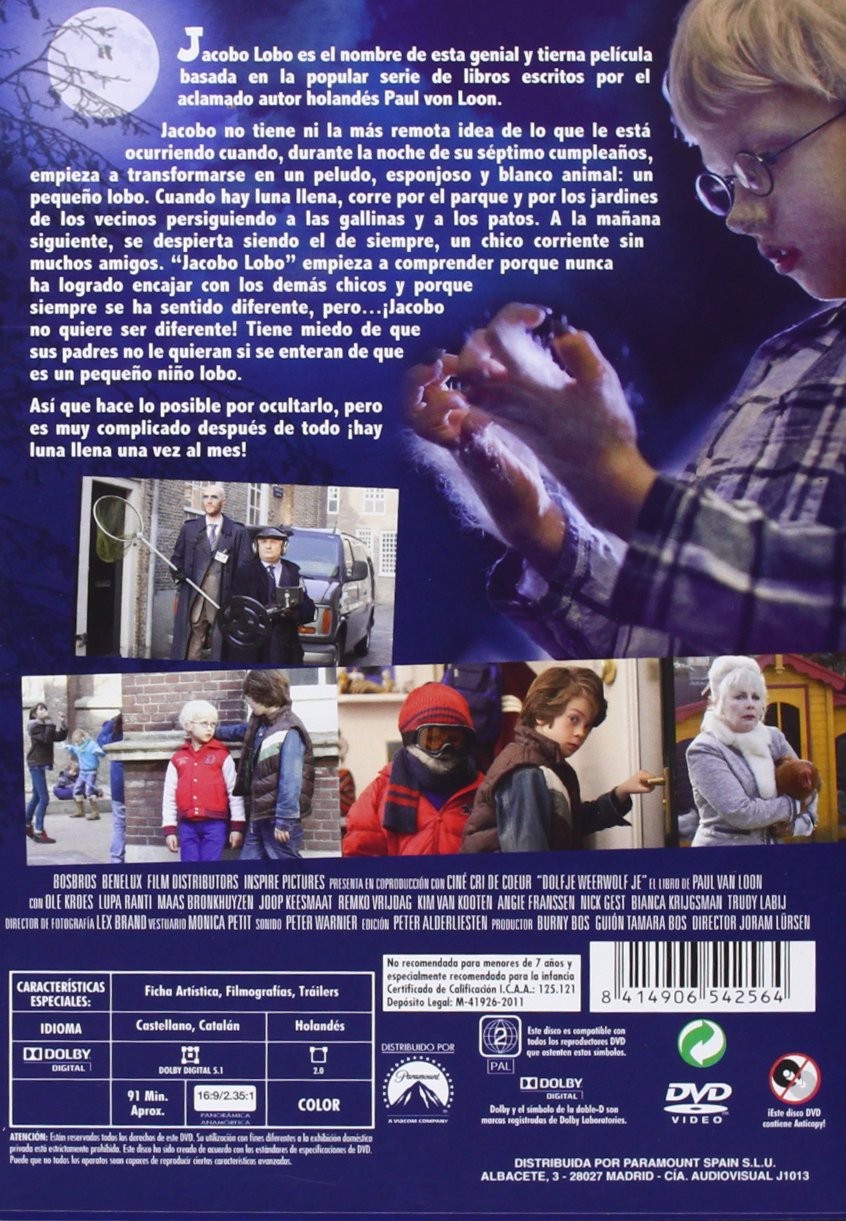https://back.dvdstorespain.es/es/peliculas/131531-jacobo-lobo-dvd-2012--8414906542564.html131531Jacobo Lobo [DVD] (2011) Dolfje WeerwolfjeJacobo no tiene ni la más remota idea de lo que le está ocurriendo cuando, durante la noche de su séptimo cumpleaños, empiezaa transformarse en un peludo, esponjoso y blanco animal: un pequeño lobo. Cuando hay luna llena corre por el parque y por los jardines de los vecinos persiguiendo a las gallinas y a los patos. A la mañana siguiente, se despierta siendo el de siempre, un chico corriente sin muchos amigos. Jacobo Lobo empieza a comprender por qué nunca ha logrado encajar con los demás chicos y por qué siempre se ha sentido diferente. Jacobo no quiere ser diferente, tiene miedo de que sus padres no le quieran si se enteran de que es un pequeño niño lobo. Así que hace lo posible por ocultarlo, pero es muy complicado, después de todo, ¡hay luna llena una vez al mes! La película “Jacobo Lobo” se basa en la popular serie de libros escritos por el autor holandés Paul Van Loon. https://dvdstorespain.es/1165846-home_default/jacobo-lobo-dvd-2012-.jpg9.2562instock9.25629.2562002026-03-31T20:45:02+0200/Inicio/Inicio/DVD/Inicio/Películas/Inicio/Nuevos