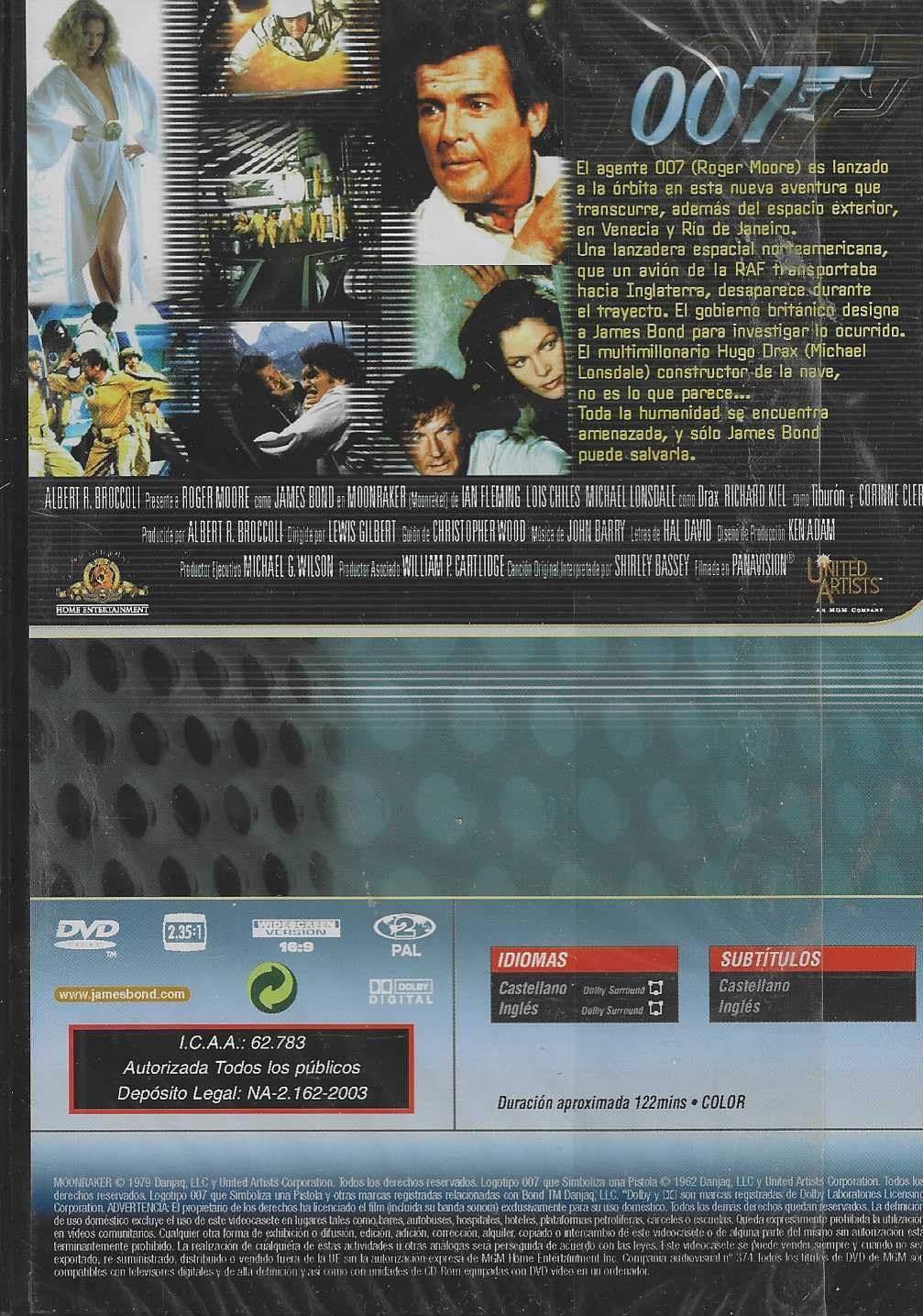 https://back.dvdstorespain.es/es/peliculas/131584-moonraker-dvd-james-bond-007-dvd-2024--0605848165784.html131584Moonraker [DVD] (1979)El agente secreto James Bond recibe la orden de localizar la nave espacial Moonraker, que ha desaparecido misteriosamente. Sus primeras pesquisas lo llevan a seguir al millonario Hugo Drax, el constructor de la nave. Tras ser capturado por Drax, Bond descubre que el villano posee una base de lanzamiento de cohetes espaciales con los que se propone esparcir un gas tóxico que acabe con la vida terrestre, pero ésta no es más que la primera fase de un perverso plan que Bond intentará frustrar con la ayuda de la Doctora Goodhead. https://dvdstorespain.es/1166492-home_default/moonraker-dvd-james-bond-007-dvd-2024-.jpg7.2727instock7.27277.2727002026-04-01T05:16:01+0200/Inicio/Inicio/DVD/Inicio/Películas/Inicio/Nuevos