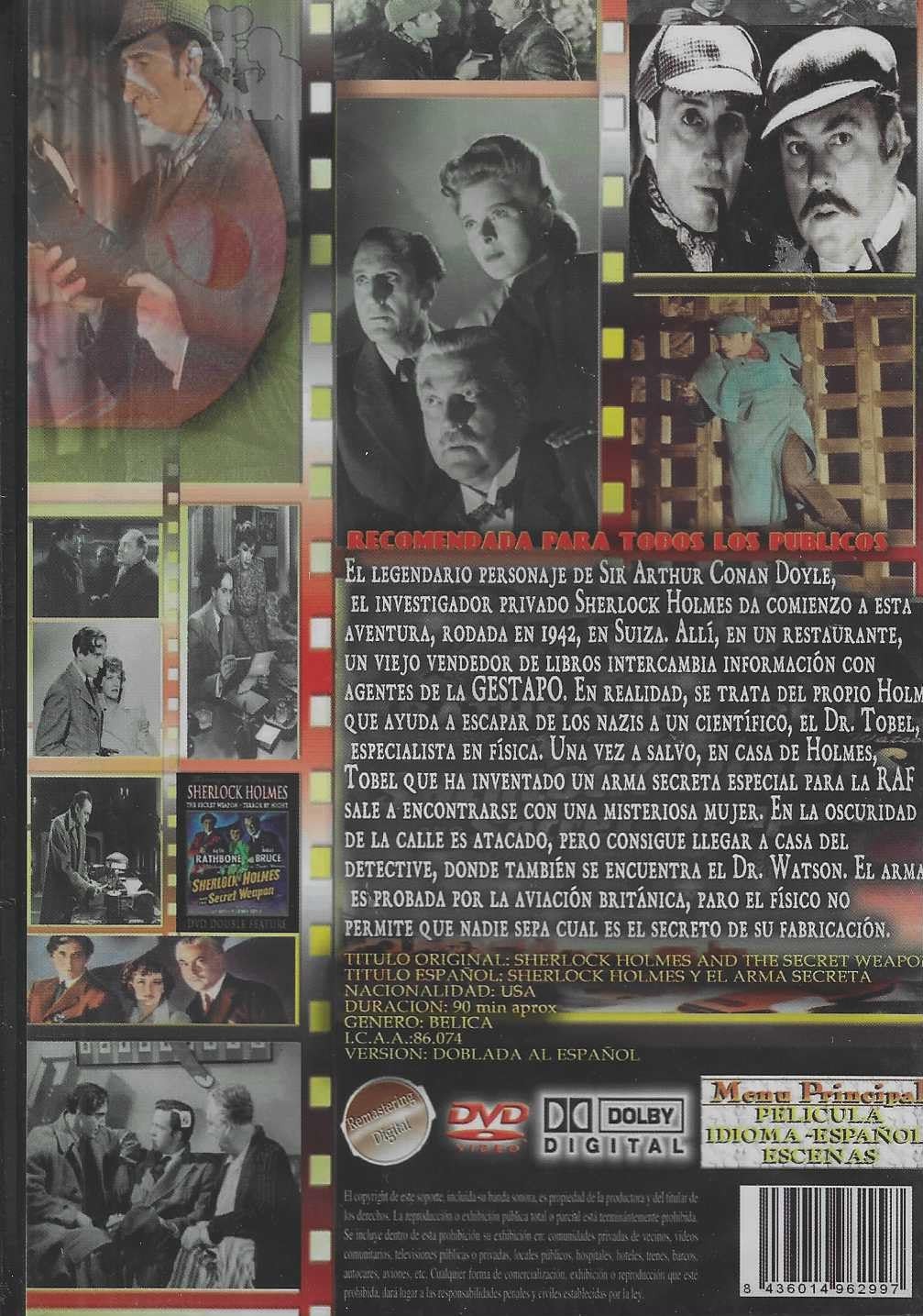 https://back.dvdstorespain.es/es/peliculas/131633-sherlock-holmes-y-el-arma-secreta-dvd-dvd-2024--0605848059397.html131633Sherlock Holmes y el Arma Secreta [DVD] (1942) Sherlock Holmes and the Secret WeaponEl detective Sherlock Holmes (Basil Rathbone) y su fiel ayudante el doctor Watson (Nigel Bruce) se enfrentan al colaboracionista nazi Profesor Moriarty. Moriarty tiene entre sus planes secuestrar a un científico británico que ha creado una nueva mira de bombardero para atacar al ejército alemán. https://dvdstorespain.es/1167420-home_default/sherlock-holmes-y-el-arma-secreta-dvd-dvd-2024-.jpg7.2727instock7.27277.2727002026-04-02T21:17:30+0200/Inicio/Inicio/DVD/Inicio/Películas/Inicio/Nuevos
