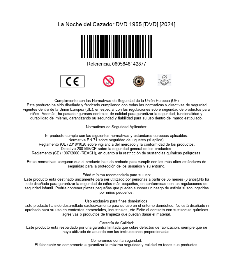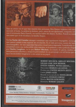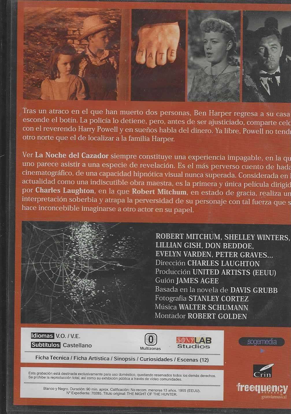 https://back.dvdstorespain.es/es/peliculas/131635-la-noche-del-cazador-dvd-1955-dvd-2024--0605848142877.html131635La Noche del Cazador [DVD] (1955) The Night of the HunterTras realizar un atraco en el que han muerto dos personas, Ben Harper regresa a su casa y esconde el botín confiando el secreto a sus hijos. En la cárcel, antes de ser ejecutado, comparte celda con Harry Powell y en sueños habla del dinero. Tras ser puesto en libertad, Powell, obsesionado por apoderarse del botín, va al pueblo de Harper, enamora a su viuda y se casa con ella. https://dvdstorespain.es/1167424-home_default/la-noche-del-cazador-dvd-1955-dvd-2024-.jpg7.2727instock7.27277.2727002026-04-02T21:17:51+0200/Inicio/Inicio/DVD/Inicio/Películas/Inicio/Nuevos