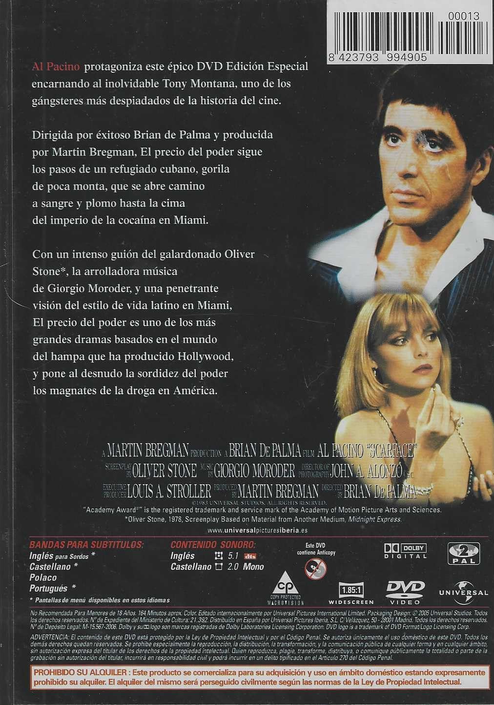 https://back.dvdstorespain.es/es/peliculas/131671-el-precio-del-poder-dvd-edician-slim-dvd-2024--0605848783582.html131671El Precio del Poder (Edición Slim) [DVD] (1983) ScarfaceTony Montana es un emigrante cubano frío e implacable que se instala en Miami con el propósito de convertirse en un gángster importante, y poder así ganar dinero y posición. Con la colaboración de su amigo Manny Rivera inicia una fulgurante carrera delictiva, como traficante de cocaína, con el objetivo de acceder a la cúpula de una organización de narcos. https://dvdstorespain.es/1167996-home_default/el-precio-del-poder-dvd-edician-slim-dvd-2024-.jpg5.2893instock5.28935.2893002026-04-04T23:17:20+0200/Inicio/Inicio/DVD/Inicio/Películas/Inicio/Nuevos