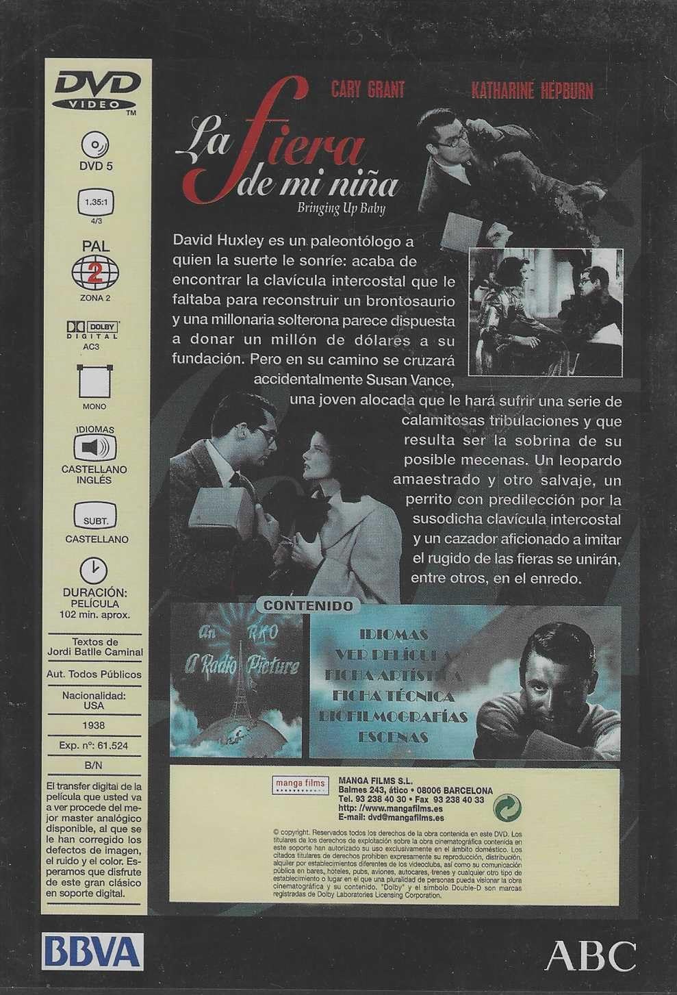 https://back.dvdstorespain.es/es/peliculas/131729-la-fiera-de-mi-nina-dvd-coleccion-grandes-directores-del-siglo-xx-dvd-2024--0605848090543.html131729La Fiera de mi Niña [DVD] (1938) Bringing Up BabyDavid Huxley (Cary Grant) es un paleontólogo tímido y despistado que está a punto de acabar la laboriosa reconstrucción del esqueleto de un brontosaurio, del que sólo le falta una clavícula intercostal. También está a punto de casarse con su anodina secretaria. En un partido de golf con el abogado de una solterona millonaria, potencial mecenas del museo para el que trabaja, Huxley conoce a Susan Vance (Katharine Hepburn), una joven adinerada y caprichosa que lo manipulará para que no lleve a cabo ninguno de sus dos proyectos. https://dvdstorespain.es/1169586-home_default/la-fiera-de-mi-nina-dvd-coleccion-grandes-directores-del-siglo-xx-dvd-2024-.jpg5.2893instock5.28935.2893002026-04-14T03:16:00+0200/Inicio/Inicio/DVD/Inicio/Películas/Inicio/Nuevos