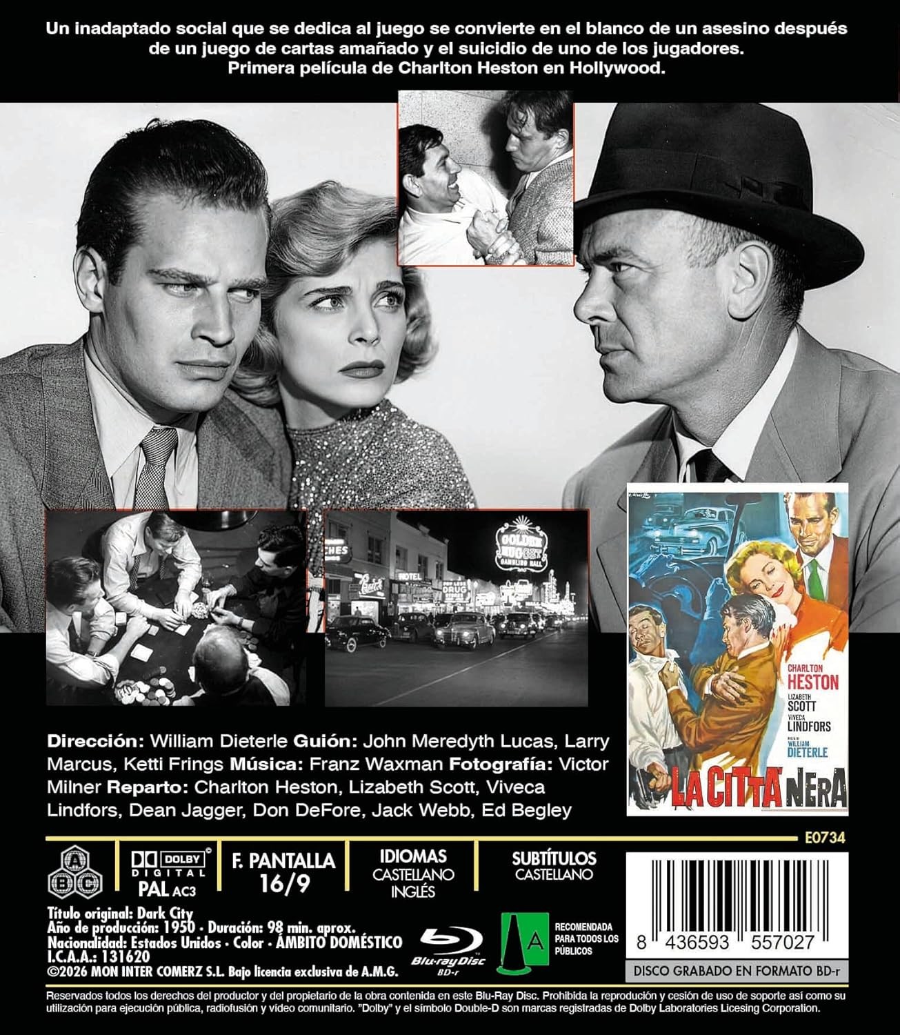 https://back.dvdstorespain.es/es/peliculas/132092-ciudad-en-sombras-bdr-dark-city-blu-ray-2026--8436593557027.html132092Ciudad en Sombras [Blu-ray R] (1950) Dark CityPrimera película de Charlton Heston en Hollywood, es un relato de cine negro, ayudado por las sombras callejeras y ese inhóspito ambiente en que viven aquellos que bordean el delito. Charlton lidera un grupo de estafadores que despluman a un hombre de negocios (Don DeFore), que se sume en la desesperación y se ahorca. Ahí es donde toma partido el hermano psicótico del fallecido (Mike Mazurki), que inicia un raid para cazar y asesinar a los cuatro jugadores (Jack Webb, Ed Begley y Harry Morgan). Para completar el cuadro aparece la novia del protagonista (Lizabeth Scott) que es cantante de cabaret. https://dvdstorespain.es/1174915-home_default/ciudad-en-sombras-bdr-dark-city-blu-ray-2026-.jpg9.0909instock9.09099.0909002026-04-17T05:46:24+0200/Inicio/Inicio/Películas/Inicio/Nuevos/Inicio/Blu-ray R