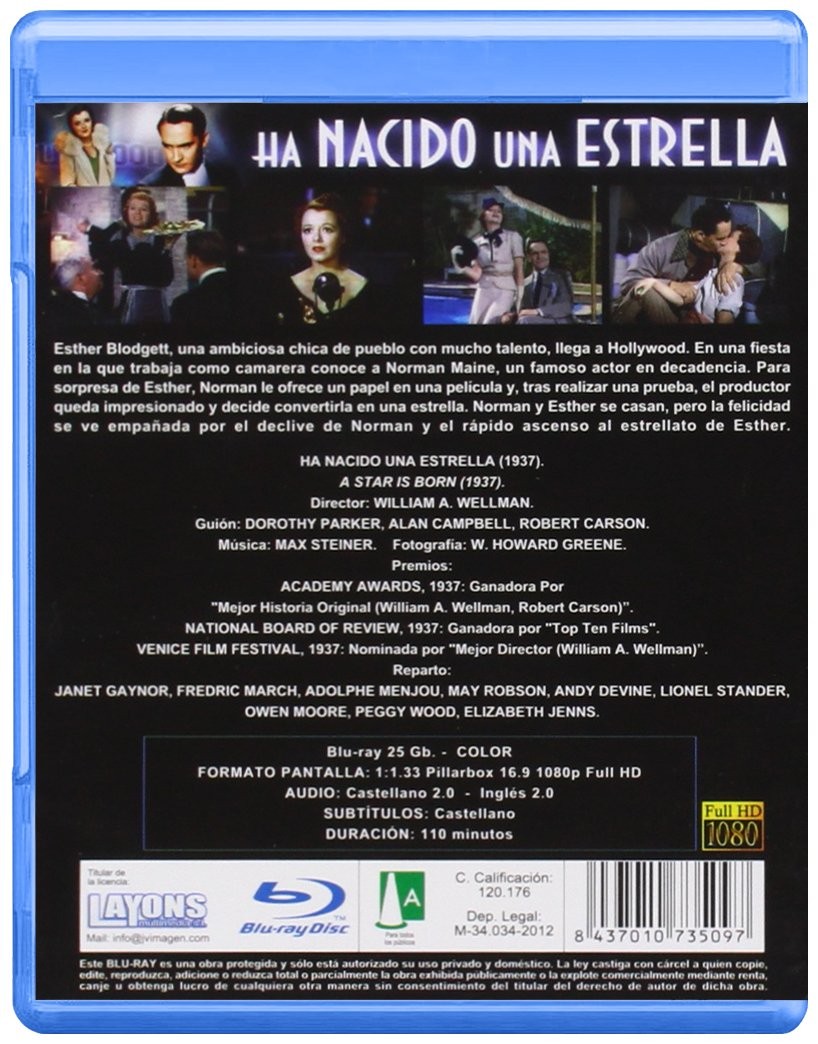 https://back.dvdstorespain.es/es/peliculas/14988-ha-nacido-una-estrella-blu-ray-1937-a-star-is-born-8437010735097.html14988Ha nacido una estrella (BLU-RAY) 1937 A Star is Born<div id="productDescription" class="a-section a-spacing-small"> <!-- show up to 2 reviews by default --><br /><p> <span>Norman Maine, un famoso actor adicto al alcohol, descubre a Esther, una joven con un gran talento para la canción y decide impulsar su carrera cinematográfica. Ella consigue la fama y, a los pocos meses, la pareja contrae matrimonio. Pero, a medida que el éxito de Esther aumenta, decae el de Norman, y esta situación lo empuja a la autodestrucción...</span> </p> </div>https://dvdstorespain.es/542853-home_default/ha-nacido-una-estrella-blu-ray-1937-a-star-is-born.jpg4.876instockKarma Films, S.L.4.8764.876002015-05-07T00:39:48+0200/Inicio/Inicio/Blu-ray/Inicio/Películas/Inicio/NuevosWilliam A. Wellman