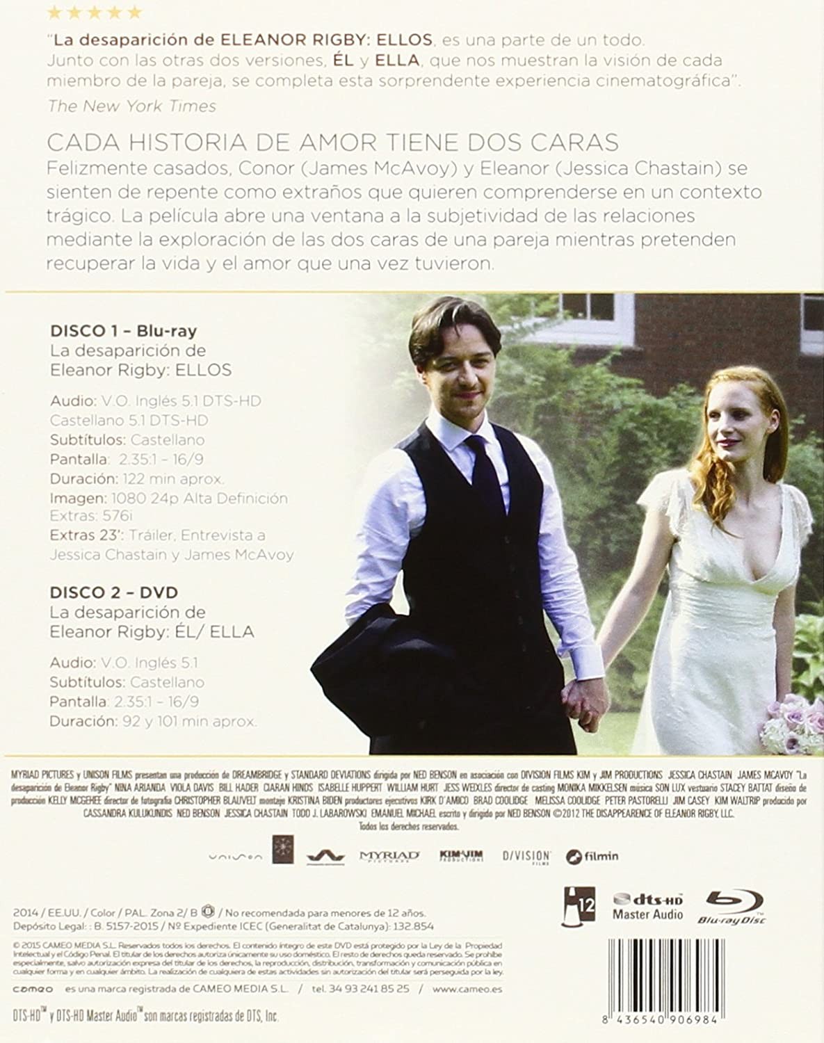 Crónica de la crisis de un matrimonio analizada en un díptico de dos películas que analiza la relación desde dos puntos de vista: el del marido (McAvoy) y el de la mujer (Chastain). 'The Disappearance of Eleanor Rigby: Her' y 'The Disappearance of Eleanor Rigby: Him' exploran la relación de una pareja de Nueva York en un momento difícil en su matrimonio, tanto desde el punto de vista del marido -dueño de un restaurante-, como desde el punto de vista de la esposa.