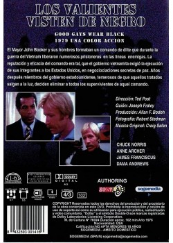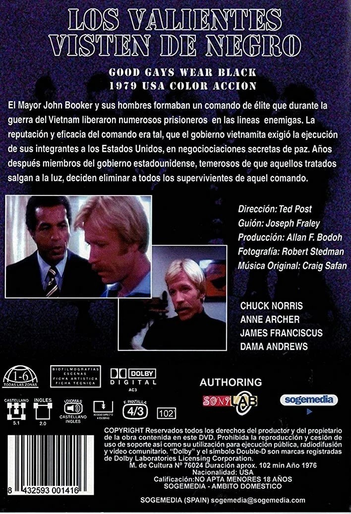 https://back.dvdstorespain.es/es/peliculas/22315-los-valientes-visten-de-negro-dvd--8432593001416.html22315Los Valientes Visten de Negro [DVD] (1978) Good Guys Wear BlackEl mayor John T. Booker mandaba un comando de élite que, durante la guerra de Vietnam, logró liberar a numerosos prisioneros. La reputación y la eficacia del comando era tal que el gobierno vietnamita llegó a exigir a los Estados Unidos, en el transcurso de unas negociaciones secretas de paz, la ejecución de sus integrantes. Años después, algunos miembros del gobierno estadounidense, temerosos de que aquel monstruoso tratado saliera a la luz, decidieron eliminar a los supervivientes del comando. https://dvdstorespain.es/529734-home_default/los-valientes-visten-de-negro-dvd-.jpg4.8347instockSotelysa, S.L.4.83474.8347002015-12-08T03:54:14+0100/Inicio/Inicio/DVD/Inicio/Películas/Inicio/Nuevos/Inicio/Homenaje a Chuck Norris