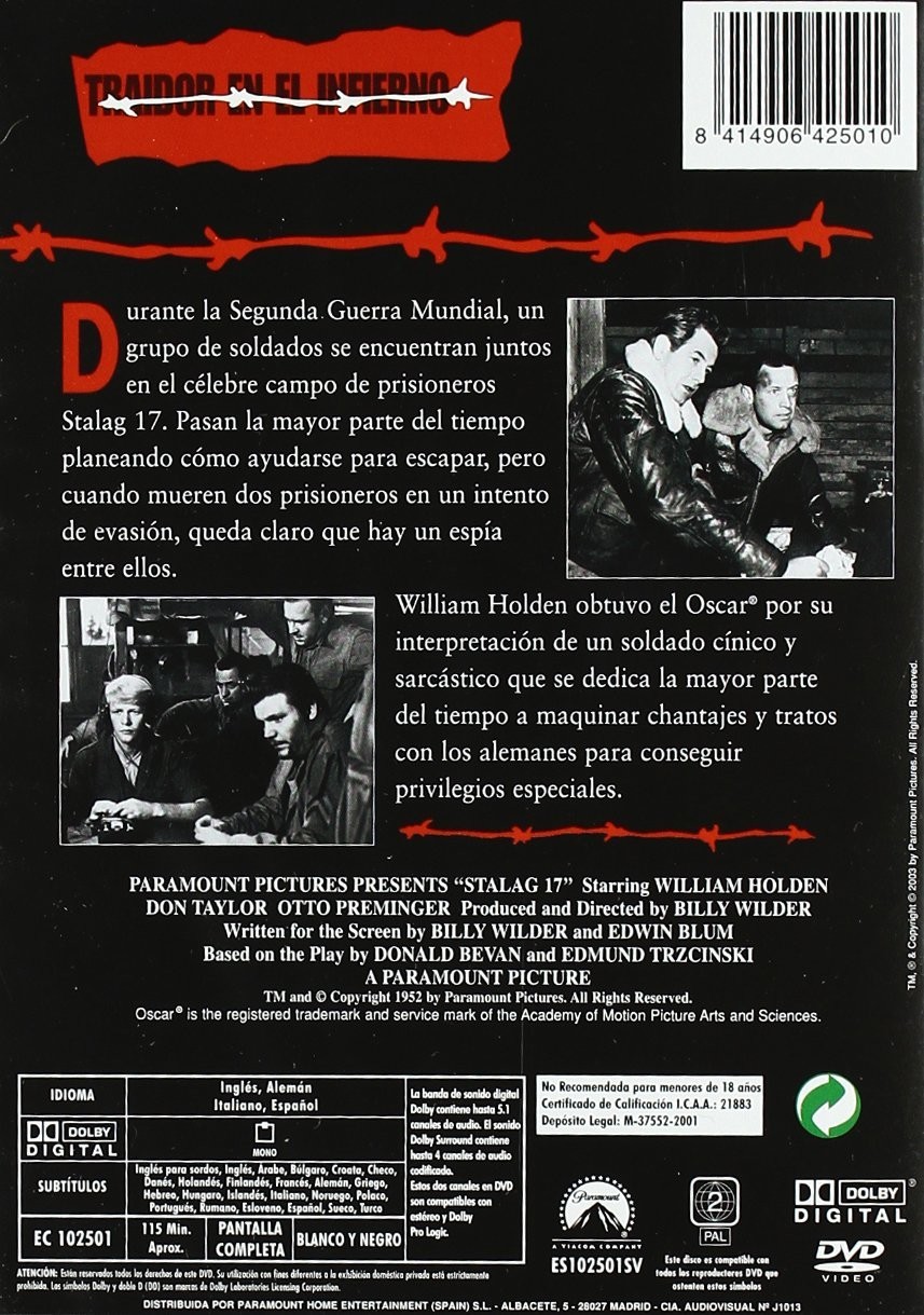 Durante la Segunda Guerra Mundial, un grupo de soldados se encuentran juntos en el célebre campo de prisioneros Stalag 17. Pasan la mayor parte del tiempo planeando cómo ayudarse para escapar, pero cuando mueren dos prisioneros en un intento de evasión, queda claro que hay un espía entre ellos. William Holden obtuvo el Oscar por su interpretación de un soldado cínico y sarcástico que se dedica la mayor parte del tiempo a maquinar chantajes y tratos con los alemanes para conseguir privilegios especiales.