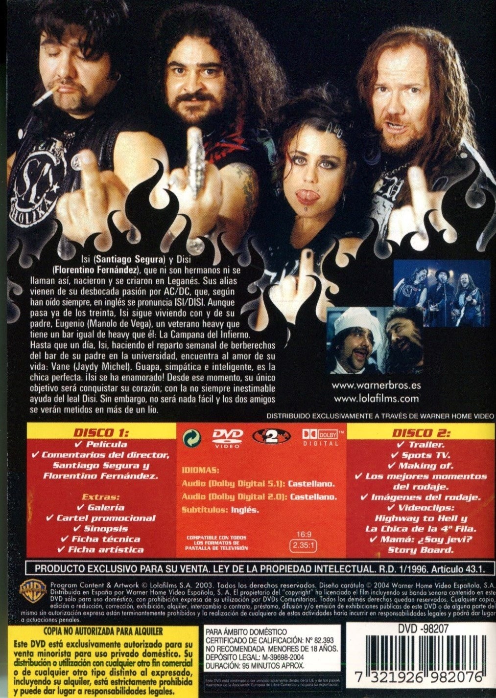 https://back.dvdstorespain.es/es/peliculas/4765-isidisi-amor-a-lo-bestia-2-dvds-2004--7321926982076.html4765Isi/Disi: Amor a lo Bestia [2 DVDs] (2004)Isi y Disi, que ni son hermanos ni se llaman así, nacieron y se criaron en Leganés. Sus alias vienen de su desbocada pasión por AC/DC, que, según han oído siempre, en inglés se pronuncia isidisi. Aunque pasa ya de los treinta, Isi sigue viviendo con y de su padre, Eugenio, un veterano heavy que tiene un bar: La Campana del Infierno. La vida de Isi transcurre plácidamente entre echarle una mano a su viejo y ensayar con su grupo, Ratamuerta, con Disi y con sus colegas El Pota y La Kuki. Hasta que un día, haciendo el reparto semanal de berberechos en el bar de la universidad de Leganés, su existencia sufre un cambio radical... al conocer al amor de su vida: Vane. Es guapa, simpática y estudia Teleco: es la chica perfecta... Desde ese momento, su único objetivo será conquistar su corazón, derribando todos los obstáculos -¡y pretendientes!- que les separan, con la -no siempre- inestimable ayuda del leal Disi. Sin embargo, la empresa no será nada fácil y los dos amigos se verán metidos en más de un lío. En su afán de conquistarla, Isi le asegura a Vane que es íntimo amigo de Joaquín Sabina, ídolo de la chica. Vane le asegura que haría "cualquier cosa" por conocerle... Al pobre Isi no le queda más remedio que renunciar a sus principios más "jevis" y conseguir que se haga realidad el sueño de su chica... a toda costa.https://dvdstorespain.es/324195-home_default/isidisi-amor-a-lo-bestia-2-dvds-2004-.jpg3.2231instockWarner Long Tail3.22313.2231002015-04-10T18:21:12+0200/Inicio/Inicio/DVD/Inicio/Películas/Inicio/NuevosChema De La Peña