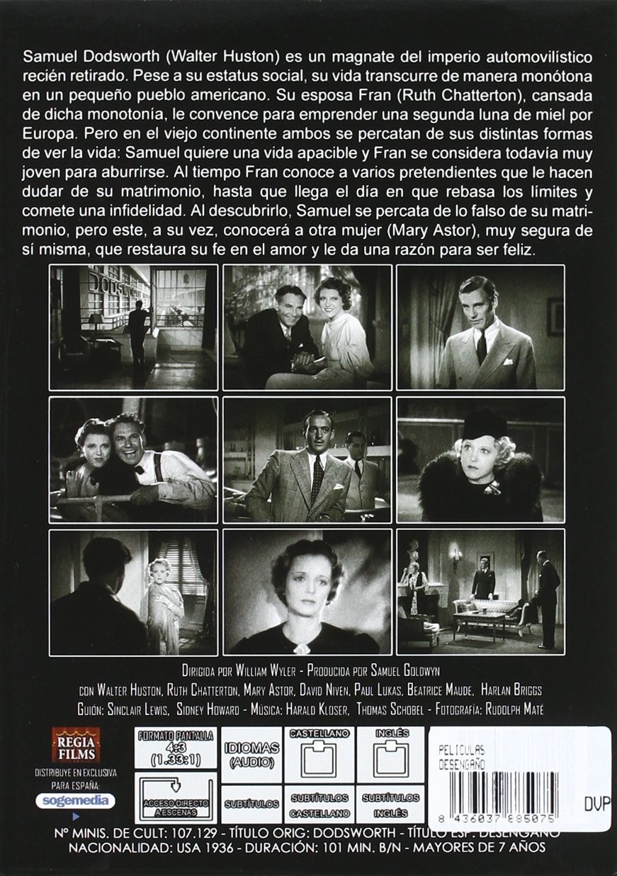 España Edition, PAL/Region 0 DVD: IDIOMAS: Español ( Mono ), Inglés ( Mono ), Español ( Subtitulos ), Inglés ( Subtitulos ), EXTRAS: Acceso De la Escena, Blanco y Negro, Menú Interactivo, SYNOPSIS: Samuel Dodsworth es un magnate de la industria del automóvil, el típico hombre de negocios que empezando desde abajo ha llegado a la cima del éxito. Él y su esposa deciden pasar una segunda luna de miel en Europa, pero durante el viaje descubre que ella le es infiel, y su mundo empieza a tambalearse. En tal circunstancia, conoce a una mujer que le devuelve la fe en el amor y lo convence de que vale la pena vivir. Gracias a ella, pondrá todos los medios a su alcance para salvar su matrimonio, pero quizá sea demasiado tarde... APANTALLADO/ADJUDICADO EL: Concesiones De la Academia De Oscar, ...Desengaño / Dodsworth ( Dods worth )