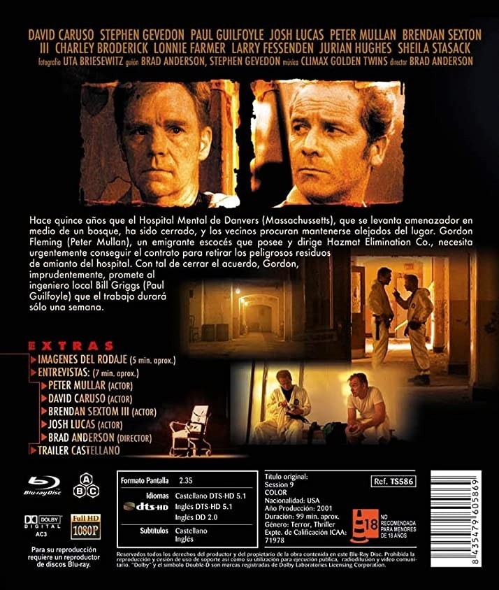https://back.dvdstorespain.es/es/peliculas/85716-session-9-blu-ray-2001-blu-ray--8435479605869.html85716Session 9 [Blu-ray] (2001)Hace quince años que el Hospital Mental de Danvers (Massachussetts), que se levanta amenazador en medio de un bosque, ha sido cerrado, y los vecinos procuran mantenerse alejados del lugar. Gordon Fleming (Peter Mullan), un emigrante escocés que posee y dirige Hazmat Elimination Co., necesita urgentemente conseguir el contrato para retirar los peligrosos residuos de amianto del hospital. Con tal de cerrar el acuerdo, Gordon, imprudentemente, promete al ingeniero local Bill Griggs (Paul Guilfoyle) que el trabajo durará sólo una semana. Una vez firmado el contrato, los hombres de Hazmat se adentran en los vastos y espeluznantes salones y pasillos del hospital. A medida que pasa el tiempo, el equipo se siente cada vez más arrastrado por los misterios que rodean al hospital.https://dvdstorespain.es/441901-home_default/session-9-blu-ray-2001-blu-ray-.jpg6.7426instockResearch Entertainment9.63226.742629.9993770893462.88972020-08-19T00:45:56+0200/Inicio/Inicio/Blu-ray/Inicio/Películas/Inicio/Nuevos/Inicio/18 AÑOS SI D&O/Inicio/REBAJAS DE ABRIL/-30%/Inicio/REBAJAS DE ABRIL