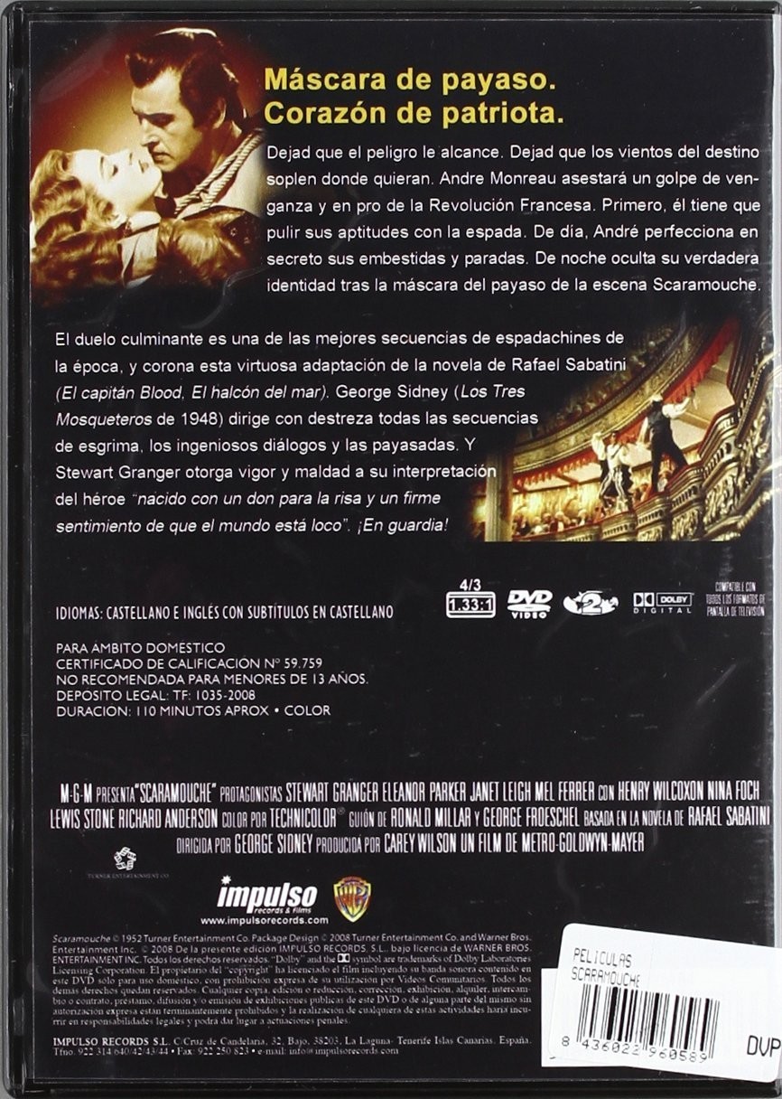 España Edition, PAL/Region 0 DVD: IDIOMAS: Español ( Dolby Digital 2.0 ), Inglés ( Dolby Digital 2.0 ), Español ( Subtitulos ), EXTRAS: Acceso De la Escena, Menú Interactivo, SYNOPSIS: Scaramouche fue el espadachín más famoso y charlatán del siglo XVIII. Su vida estuvo llena de aventuras y amoríos. Era hijo de un noble francés que tenía motivos para ocultarle su identidad, razón por la cual Scaramouche ignoraba sus orígenes. Su padre adoptivo, muy amigo de su padre biológico, era Philip de Valmorín, a quien tuvo que ayudar a huir de los hombres del Rey que lo acusaban de sedición... ...Scaramouche