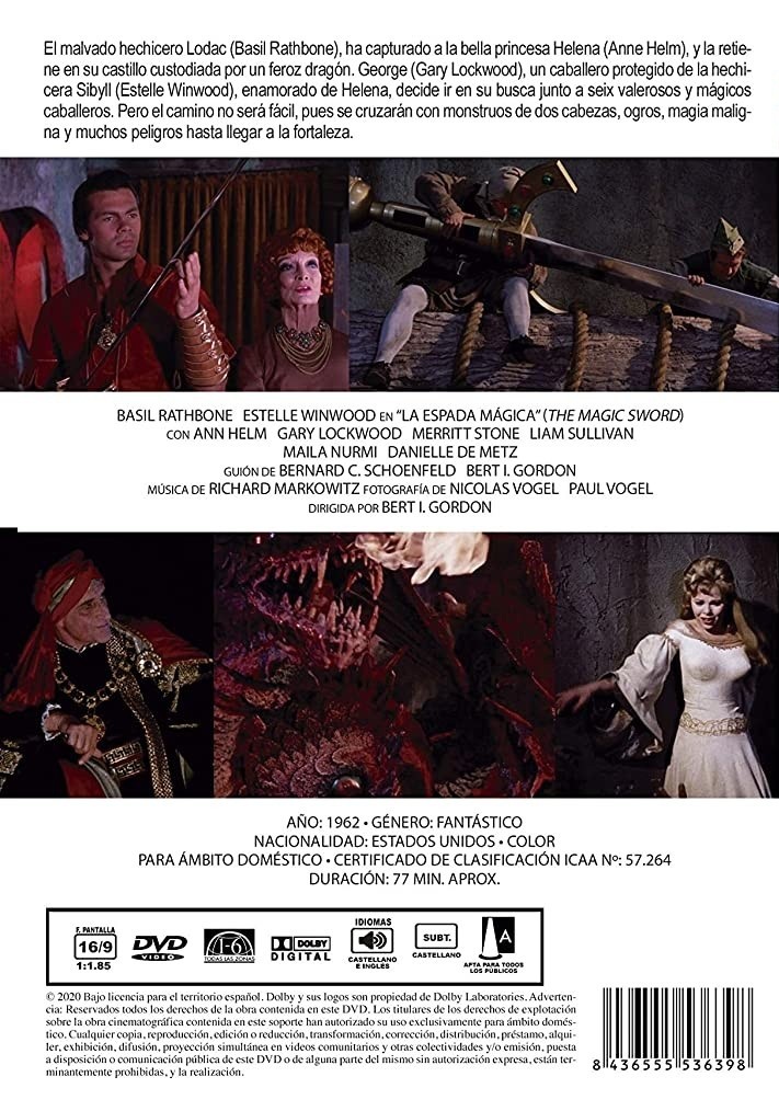 https://back.dvdstorespain.es/es/peliculas/87201-la-espada-magica-dvd-1962-the-magic-sword-dvd--8436555536398.html87201La Espada Mágica [DVD] (1962) The Magic SwordEl malvado hechicero Lodac (Basil Rathbone), ha capturado a la bella princesa Helena (Anne Helm), y la retiene en su castillo custodiada por un feroz dragón. George (Gary Lockwood), un caballero protegido de la hechicera Sibyll (Estelle Winwood), enamorado de Helena, decide ir en su busca junto a seix valerosos y mágicos caballeros. Pero el camino no será fácil, pues se cruzarán con monstruos de dos cabezas, ogros, magia maligna y muchos peligros hasta llegar a la fortalezahttps://dvdstorespain.es/436277-home_default/la-espada-magica-dvd-1962-the-magic-sword-dvd-.jpg3.4132instockResearch Entertainment4.8763.4132301.46282020-11-28T00:17:38+0100/Inicio/Inicio/DVD/Inicio/Películas/Inicio/Nuevos/Inicio/VELADA SP 70/Inicio/VELADA DE 100/Inicio/VELADA FR 100/Inicio/VELADA IT 100/Inicio/REBAJAS DE ABRIL/-30%/Inicio/REBAJAS DE ABRIL
