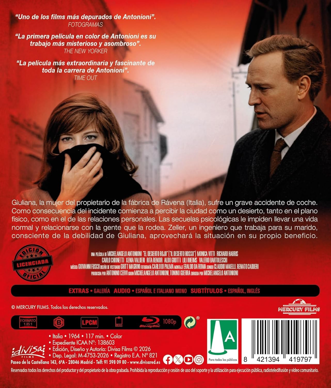 https://back.dvdstorespain.es/es/preventa/130111-el-desierto-rojo-il-deserto-rosso-red-desert-1964-michelangelo-antonioni-blu-ray-blu-ray-2026--8421394419797.html130111El Desierto Rojo [Blu-ray] (1964) Il deserto rossoDespués de sufrir un grave accidente de coche, una mujer comienza a percibir la ciudad en que vive, Rávena, como un desierto tanto en el plano físico como en el de las relaciones personales. Las secuelas psicológicas le impiden llevar una vida normal y relacionarse con la gente que la rodea. https://dvdstorespain.es/1143823-home_default/el-desierto-rojo-il-deserto-rosso-red-desert-1964-michelangelo-antonioni-blu-ray-blu-ray-2026-.jpg14.4628instock14.462814.4628002026-03-05T19:30:48+0100/Inicio/Inicio/Blu-ray/Inicio/Películas/Inicio/Preventa