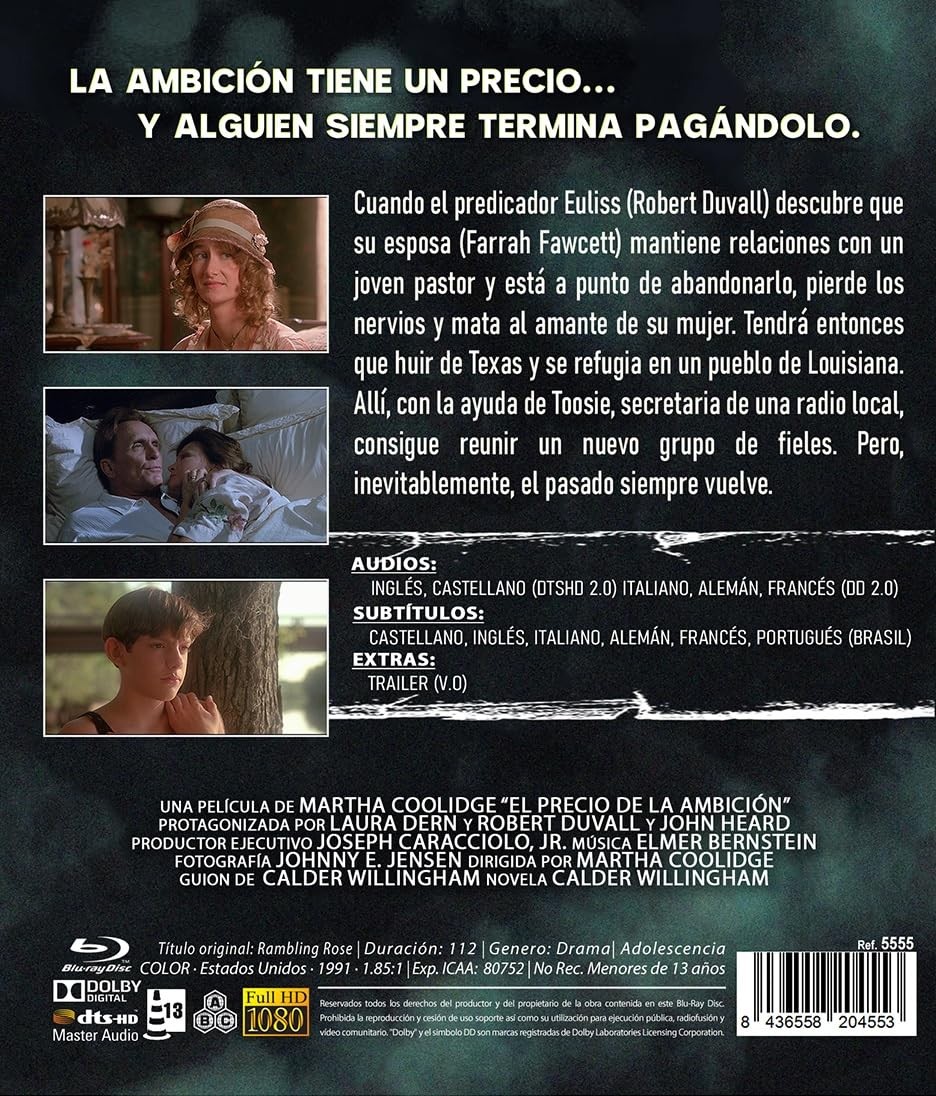 https://back.dvdstorespain.es/es/preventa/130301-el-precio-de-la-ambicion-blu-ray-1991-rambling-rose-blu-ray-2026--8436558204553.html130301El Precio de la Ambición [Blu-ray] (1991) Rambling RoseGeorgia, 1971. Buddy Hillyer regresa a la vieja mansión familiar. Huérfano de madre, va a visitar a su padre. Numerosos recuerdos del pasado se agolpan en su cabeza, sobre todo la turbadora aparición de la joven y desinhibida Rose (Laura Dern), una tarde de agosto de 1935. Buddy (Lukas Haas) tenía trece años y ella diecinueve. Llegó a la casa, sensual y coqueta, contratada por sus padres para ayudar en las tareas domésticas. Fue el primer amor de Buddy, pero provocó problemas en la familia por el descontrol absoluto de sus impulsos sexuales. https://dvdstorespain.es/1147176-home_default/el-precio-de-la-ambicion-blu-ray-1991-rambling-rose-blu-ray-2026-.jpg10.7025instock10.702510.7025002026-03-13T23:30:30+0100/Inicio/Inicio/Blu-ray/Inicio/Películas/Inicio/Preventa/Inicio/Homenaje a Robert Duvall