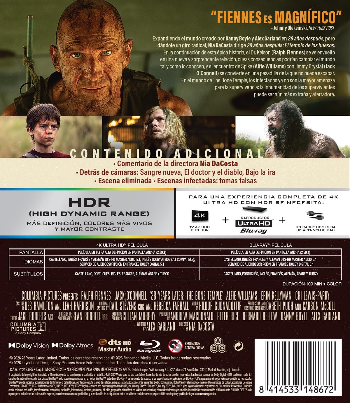 https://back.dvdstorespain.es/es/preventa/131081-28-anos-despues-el-templo-de-los-huesos-4k-uhd-bd-blu-ray-2026--8414533148672.html13108128 Años Después: El Templo de los Huesos [4K UHD, Blu-ray] (2026) 28 Years Later: The Bone TempleEl Dr. Kelson (Ralph Fiennes) se ve envuelto en una nueva y sorprendente relación, cuyas consecuencias podrían cambiar el mundo tal y como se conoce,. Por otra parte, el encuentro de Spike (Alfie Williams) con Jimmy Crystal (Jack O'Connell) se convierte en una pesadilla de la que el chico no puede escapar. En este mundo, los infectados ya no son la mayor amenaza para la supervivencia, ya que la inhumanidad de los supervivientes puede ser aún más extraña y aterradora. https://dvdstorespain.es/1158368-home_default/28-anos-despues-el-templo-de-los-huesos-4k-uhd-bd-blu-ray-2026-.jpg22.2314instock22.231422.2314002026-03-25T03:15:16+0100/Inicio/Inicio/Películas/Inicio/4K-UHD/Inicio/Preventa