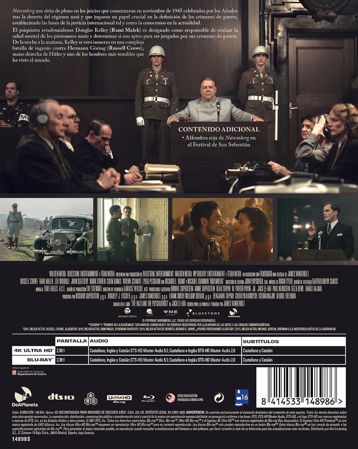 https://back.dvdstorespain.es/es/preventa/131086-nuremberg-4k-ultra-hd-bd-edicion-metalica-blu-ray-2026--8414533148986.html131086Núremberg (Edición metálica) [4K UHD, Blu-ray] (2025) NurembergTras el fin de la II Guerra Mundial, con ocasión de los cruciales e inminentes juicios de Nuremberg contra el derrotado régimen Nazi, el psiquiatra estadounidense Douglas Kelley (Malek), encargado de determinar si los oficiales nazis prisioneros son aptos para ser juzgados por sus crímenes de guerra, se ve inmerso en una compleja batalla de ingenio dialéctico con Hermann Göring (Crowe), mano derecha de Hitler. Basada en el libro "El nazi y el psiquiatra", de Jack El-Hai.https://dvdstorespain.es/1158387-home_default/nuremberg-4k-ultra-hd-bd-edicion-metalica-blu-ray-2026-.jpg32.9752instock32.975232.9752002026-03-25T03:15:52+0100/Inicio/Inicio/Blu-ray/Inicio/Películas/Inicio/Preventa