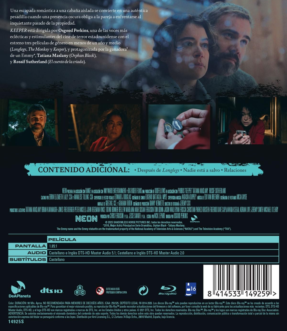 https://back.dvdstorespain.es/es/preventa/131102-keeper-bd-blu-ray-2026--8414533149259.html131102Keeper [Blu-ray] (2025)Una pareja, para celebrar su aniversario, hace una escapada romántica de fin de semana a una cabaña aislada. Cuando Malcolm (Sutherland) regresa repentinamente a la ciudad, Liz (Maslany) se encuentra aislada y en presencia de un mal indescriptible que desvela los horripilantes secretos de la cabaña.https://dvdstorespain.es/1158431-home_default/keeper-bd-blu-ray-2026-.jpg18.0992instock18.099218.0992002026-03-25T03:18:02+0100/Inicio/Inicio/Blu-ray/Inicio/Películas/Inicio/Preventa