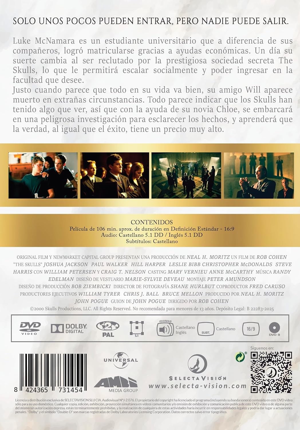 https://back.dvdstorespain.es/es/preventa/131129-the-skulls-pelicula-dvd-2026--8424365731454.html131129The Skulls: Sociedad Secreta [DVD] (2000) The SkullsLuke McNamara (Joshua Jackson), un estudiante universitario perteneciente a la clase trabajadora, se une a una fraternidad elitista y secreta conocida como "The Skulls", esperando conseguir ser aceptado en la escuela de derecho de Harvard. Su fascinación inicial de pertenecer a un club tan prestigioso se verá pronto enturbiada por una serie de incidentes, entre ellos el suicidio de su amigo y compañero de cuarto Will, un estudiante de periodismo. https://dvdstorespain.es/1158938-home_default/the-skulls-pelicula-dvd-2026-.jpg9.9174instock9.91749.9174002026-03-25T04:32:00+0100/Inicio/Inicio/DVD/Inicio/Películas/Inicio/Preventa