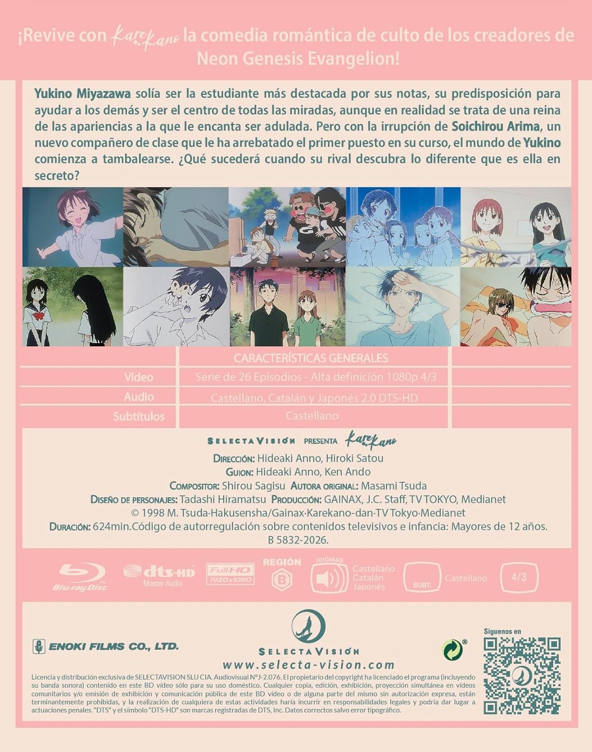 https://back.dvdstorespain.es/es/preventa/131133-kare-kano-edicion-digital-serie-completa-blu-ray-1998-kareshi-kanojo-no-jijo-8424365732857.html131133Kare Kano (Edición digital serie completa) [Blu-ray] (1998) Kareshi Kanojo no Jijô (Circumstances of a Boyfriend and Girlfriend)Serie de TV (1998-1999). 26 episodios. La historia trata de una chica llamada Yukino Miyazawa, que desde pequeña quiere ser la mejor en la escuela para que todos la admiren. Pero cuando entra al instituto se topa con una competencia, Sôichirô Arima, quien de inmediato se convierte en el centro de admiración de todos, en especial de las féminas, por su atractivo, gentileza e inteligencia, quedando Yukino relegada al segundo plano, lo que no la deja muy contenta, deseando así derrotarlo para volver a ser la número uno. Pero después de muchas "circunstancias" se da cuenta de que no es precisamente odio lo que siente por él y poco a poco ella va descubriendo su mundo interior y en ese camino también el de Arima.https://dvdstorespain.es/1158948-home_default/kare-kano-edicion-digital-serie-completa-blu-ray-1998-kareshi-kanojo-no-jijo.jpg31.3223instock31.322331.3223002026-03-25T04:32:26+0100/Inicio/Inicio/Blu-ray/Inicio/Películas/Inicio/Series de TV/Inicio/Preventa