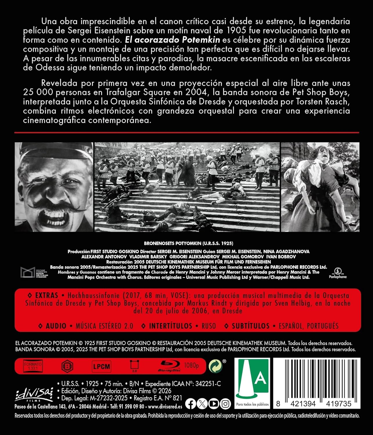 https://back.dvdstorespain.es/es/preventa/131590-el-acorazado-potemkin-battleship-potemkin-pet-shop-boys-score-1925-sergei-m-eisenstein-blu-ray-blu-ray-2026--8421394419735.html131590El Acorazado Potemkin [Blu-ray] (1925) Bronenosets Potyomkin (Battleship Potemkin)Basada en hechos reales ocurridos en 1905. El acorazado Potemkin acaba de regresar de la guerra con Japón y su tripulación está a punto de amotinarse debido al trato brutal y a las malas raciones. Cuando una mañana les sirven carne infestada de gusanos, los marineros acaban rebelándose. se cansan del tratamiento vejatorio e injusto de los oficiales. Con este motín comienza el reguero revolucionario por Odesa y toda Rusia en contra de las tropas del Zar. https://dvdstorespain.es/1166961-home_default/el-acorazado-potemkin-battleship-potemkin-pet-shop-boys-score-1925-sergei-m-eisenstein-blu-ray-blu-ray-2026-.jpg14.4628instock14.462814.4628002026-04-02T03:45:02+0200/Inicio/Inicio/Blu-ray/Inicio/Películas/Inicio/Preventa